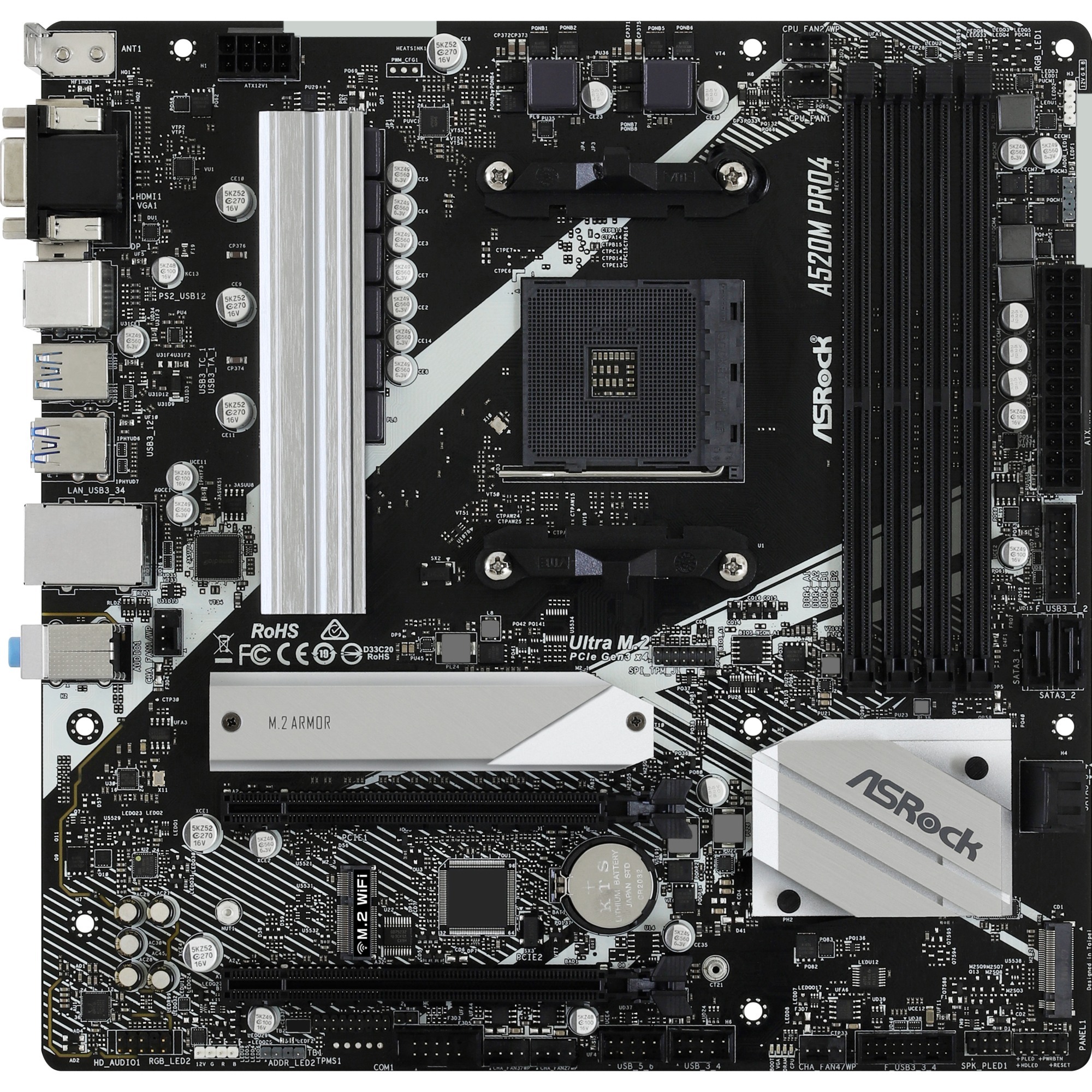 Socket de processeur (réceptable de processeur): Emplacement AM4, Processeurs compatibles: AMD Ryzen™ 3 de 3e génération, AMD Ryzen 5 de 3e génération, AMD Ryzen™ 7 de 3e…. Types de mémoire pris en charge: DDR4-SDRAM, Mémoire interne maximale: 64 Go, Type de support (slot): DIMM. Interfaces de lecteur de stockage prises en charge: M.2, SATA III. Famille d’adaptateur graphique: AMD, Adaptateur graphique: Radeon Vega. Type d’interface Ethernet: Gigabit Ethernet, Contrôleur de réseau local (LAN): Realtek RTL8111H