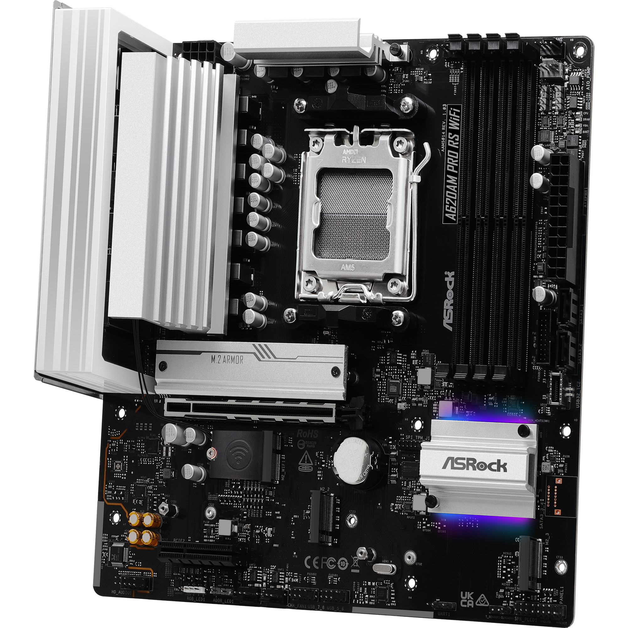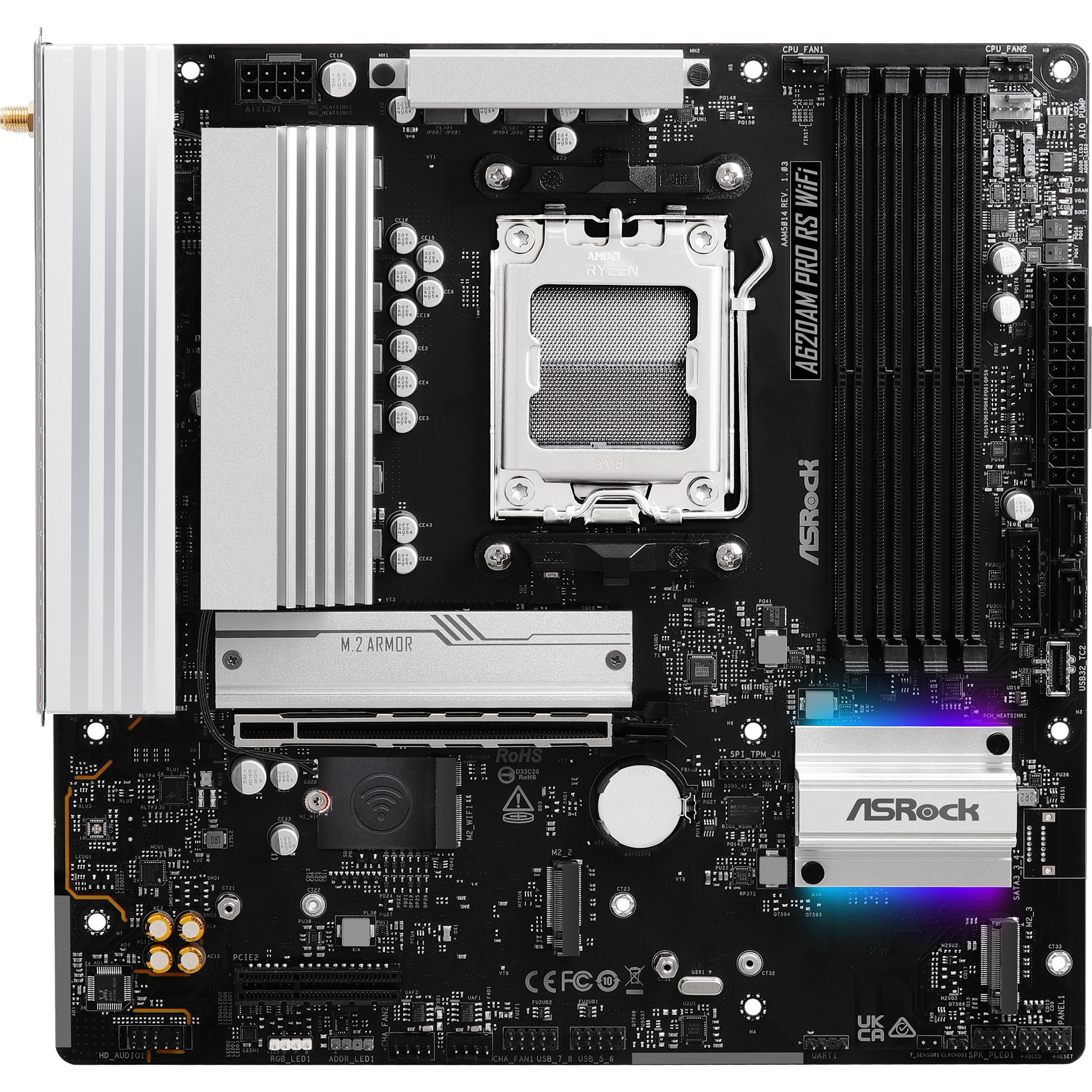 L’ASRock A620AM PRO RS WIFI est basé sur le chipset AMD A620 et prend en charge les processeurs AMD pour socket AM5. Il dispose de quatre emplacements DDR5 pour un maximum de 256 Go de RAM. Les autres caractéristiques de l’ASRock A620AM PRO RS WIFI incluent un emplacement PCIe 4.0 x16. De plus, l’ASRock A620AM PRO RS WIFI dispose d’un son à 8 canaux, d’une interface LAN 2,5 Gigabit, de deux ports SATA3, de trois ports M.2, du Wi-Fi 6E, du Bluetooth 5.2 et d’une gamme de ports USB.