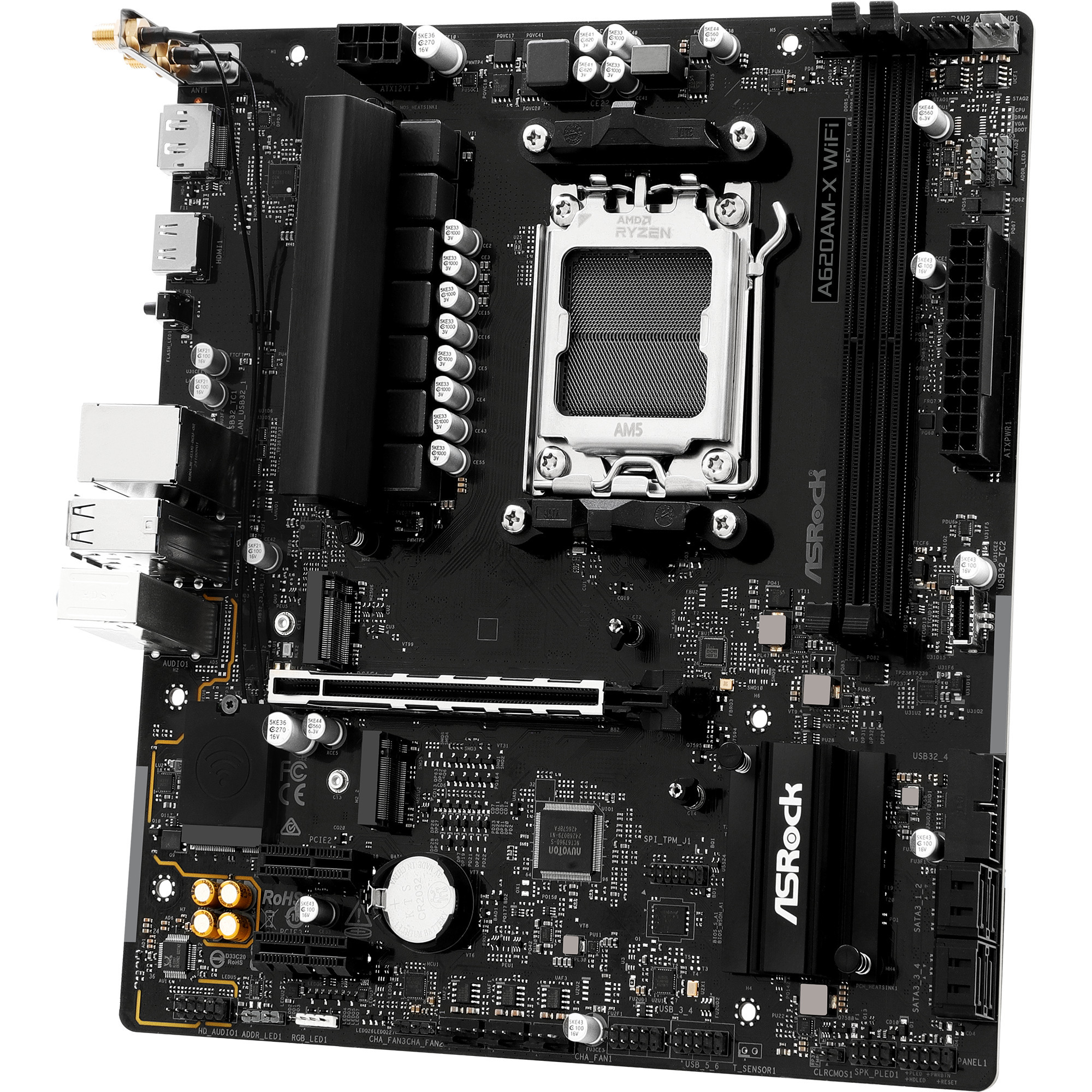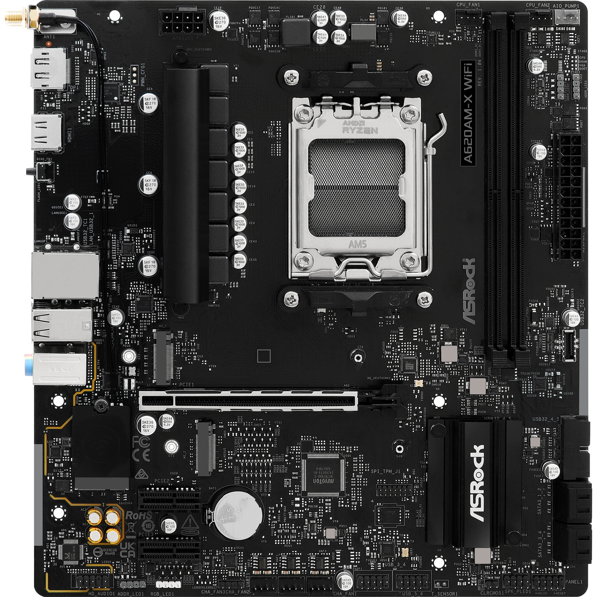 L’ASRock A620AM-X WIFI est basé sur le chipset AMD A620 et supporte les processeurs AMD pour le socket AM5. Il dispose de deux slots DDR5 pouvant accueillir jusqu’à 128 Go de mémoire vive. L’ASRock A620AM-X WIFI est également équipé d’un slot PCIe 4.0-x16 et de deux slots PCIe 3.0-x1. L’ASRock A620AM-X WIFI dispose également d’un son 8 canaux, d’une interface LAN 2.5 Gigabit, de quatre ports SATA3, de deux ports M.2, du WiFi5, du Bluetooth 5.0 et d’une série d’interfaces USB.
