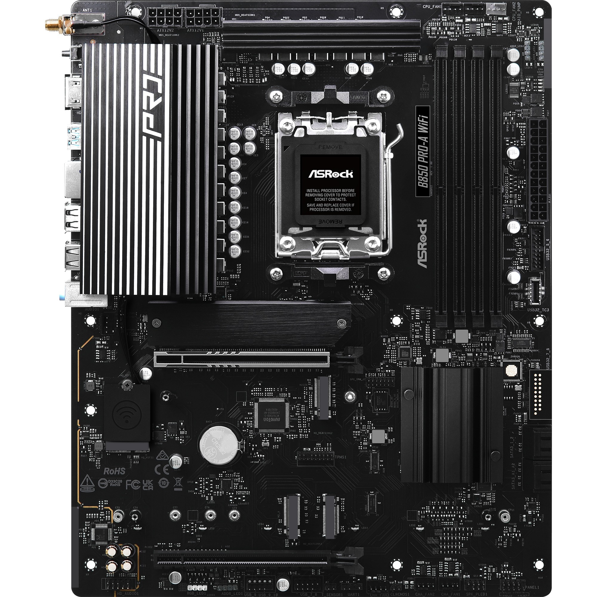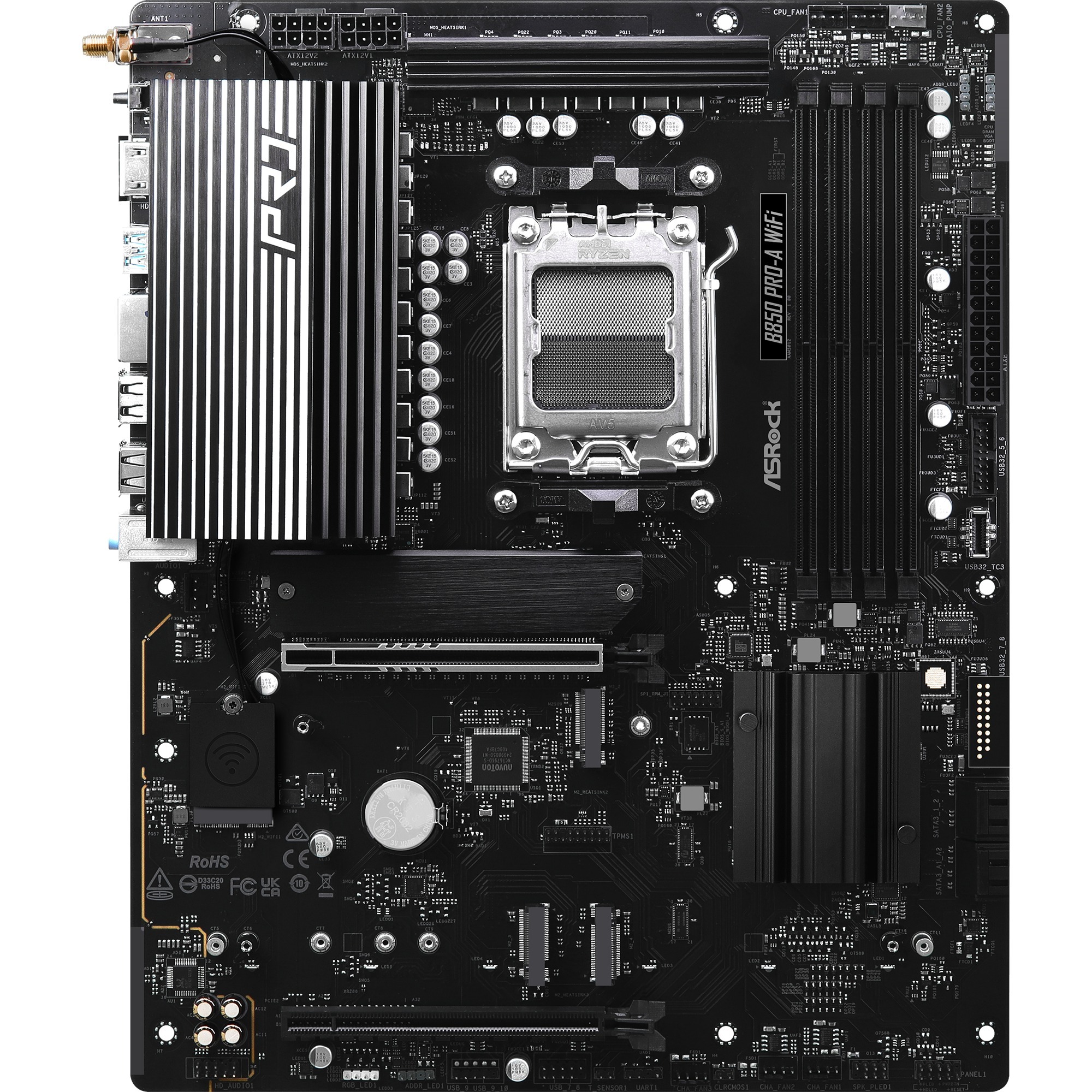 La carte mère ASRock B850 Pro-A WiFi est basée sur le chipset AMD B850 et prend en charge les processeurs AMD pour le socket AM5. Elle dispose de quatre emplacements DDR5 pour un maximum de Go de mémoire vive. La B850 Pro-A WiFi est également équipée d’un emplacement PCIe 5.0 x16 et d’un emplacement PCIe 4.0 x16. La B850 Pro-A WiFi dispose également d’un son 8 canaux, d’une interface LAN 2,5 Gigabit, du Wi-Fi 6E, du Bluetooth 5.4, de quatre ports SATA3, de quatre ports M.2 et d’une gamme d’interfaces USB.