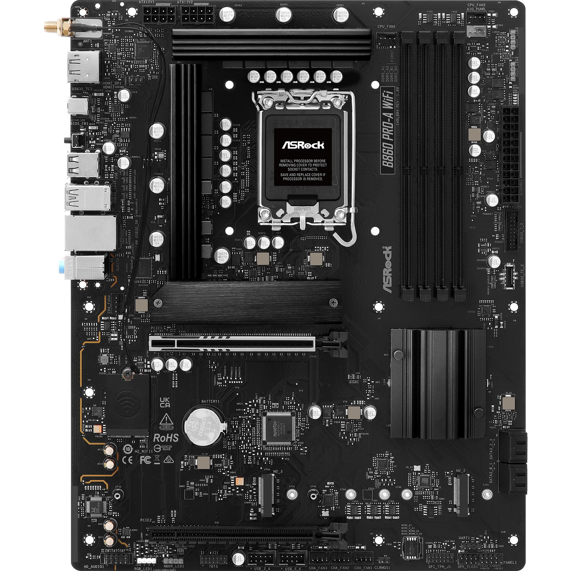 L’ASRock B860 Pro-A WiFi est basée sur le chipset Intel® B860 et prend en charge les processeurs Intel® pour socket 1851. Elle dispose de quatre emplacements DDR5 pour un maximum de 256 Go de RAM. L’ASRock B860 Pro-A WiFi est également équipée d’un emplacement PCIe 5.0 x16 et d’un emplacement PCIe 4.0 x16 (x4 voies). La carte mère ASRock B860 Pro-A WiFi dispose également d’un son 8 canaux, d’une interface LAN 2,5 Gigabit, du WiFi 6E, du Bluetooth 5.3, de quatre ports SATA3, de trois ports M.2 et d’une série d’interfaces USB.