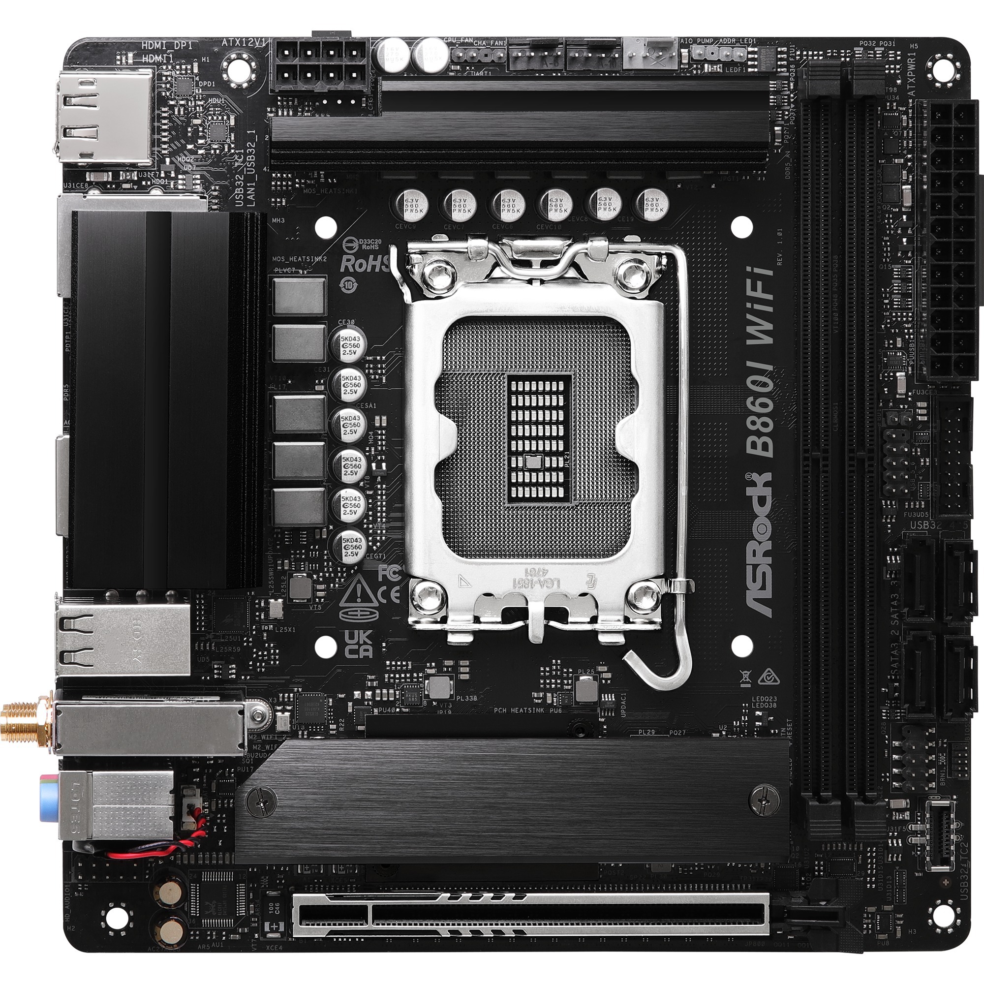 La carte mère ASRock B860I WiFi est basée sur le chipset Intel® B860 et prend en charge les processeurs Intel® pour socket 1851. Elle dispose de deux emplacements DDR5 pour un maximum de 128 Go de RAM. La carte mère ASRock B860I WiFi est également équipée d’un emplacement PCIe 5.0 x16. La carte mère ASRock B860I WiFi dispose également d’un son 8 canaux, d’une interface LAN 2,5 Gigabit, du WiFi 6E, du Bluetooth 5.3, de deux ports SATA3, de deux ports M.2 et d’une série d’interfaces USB.