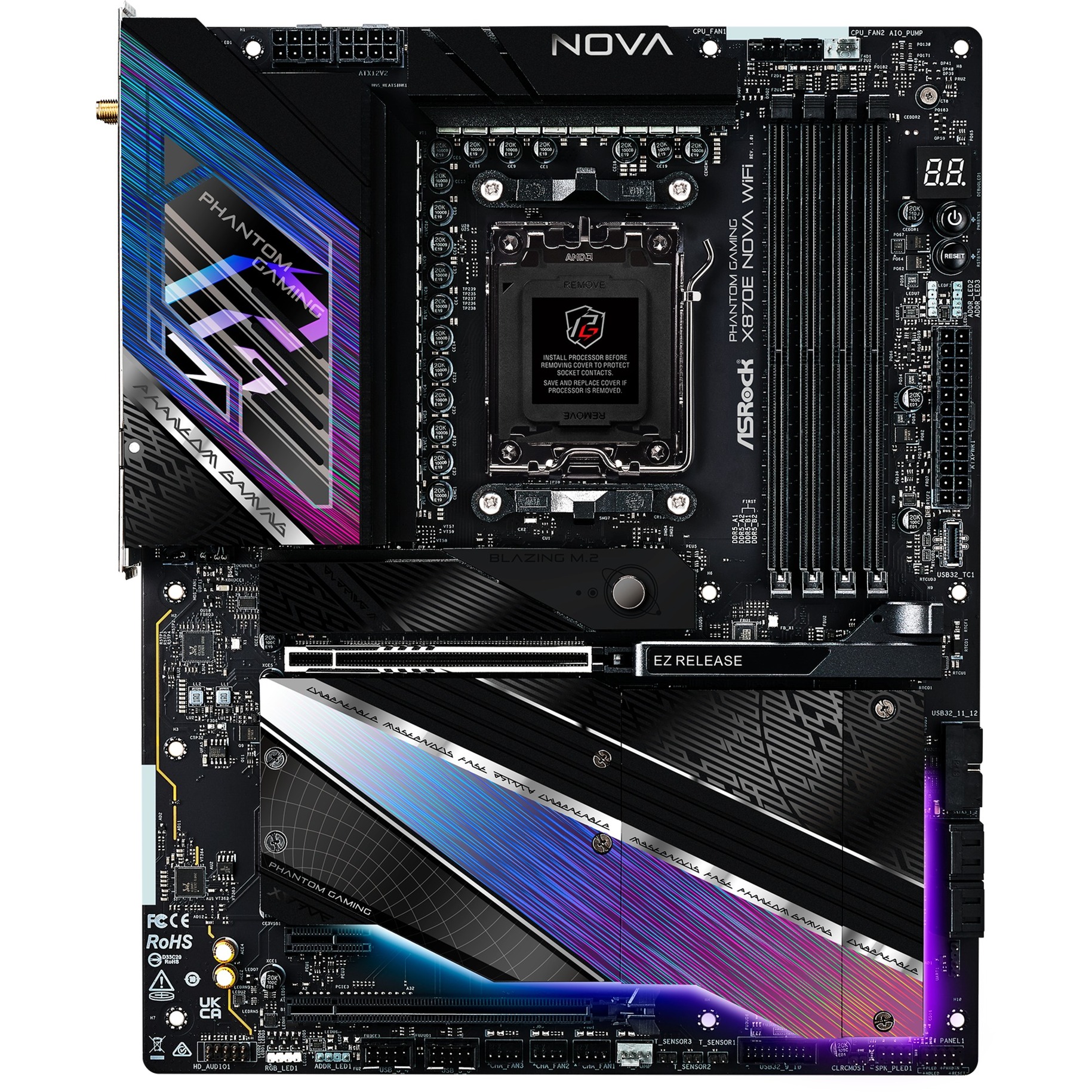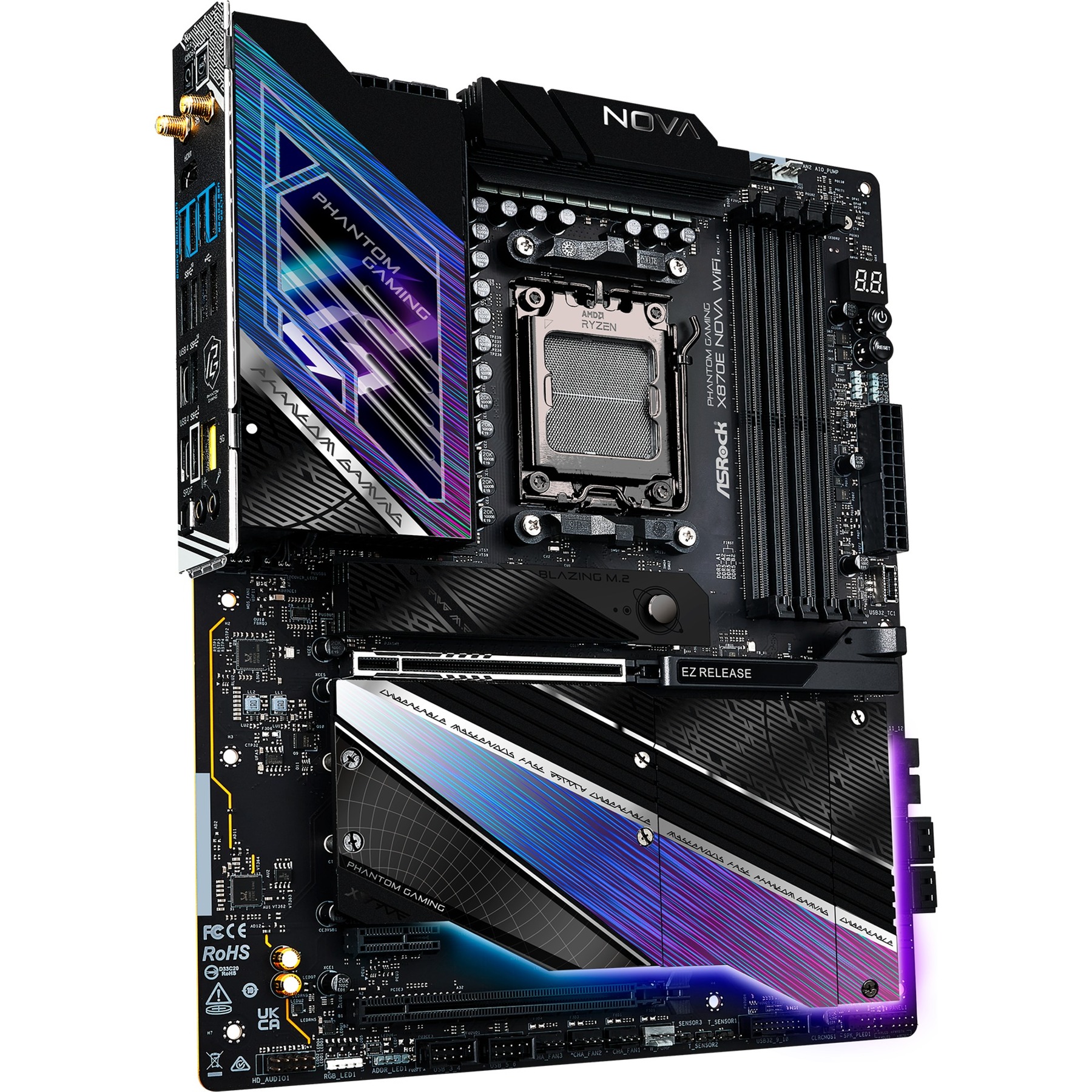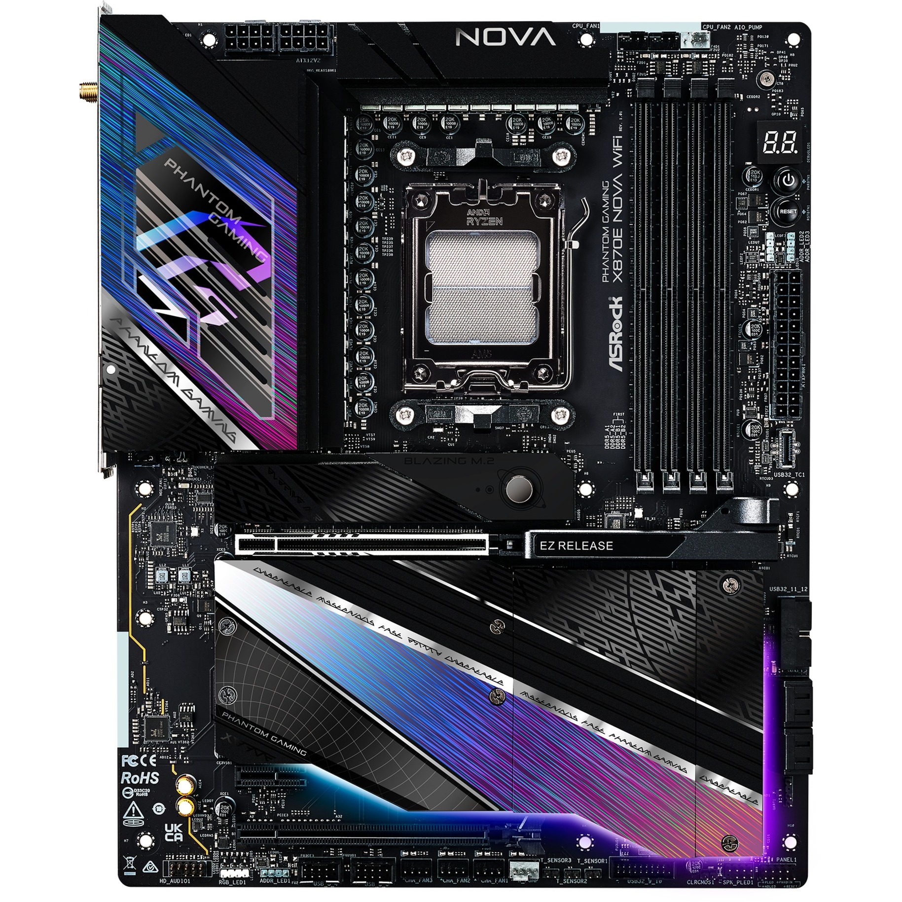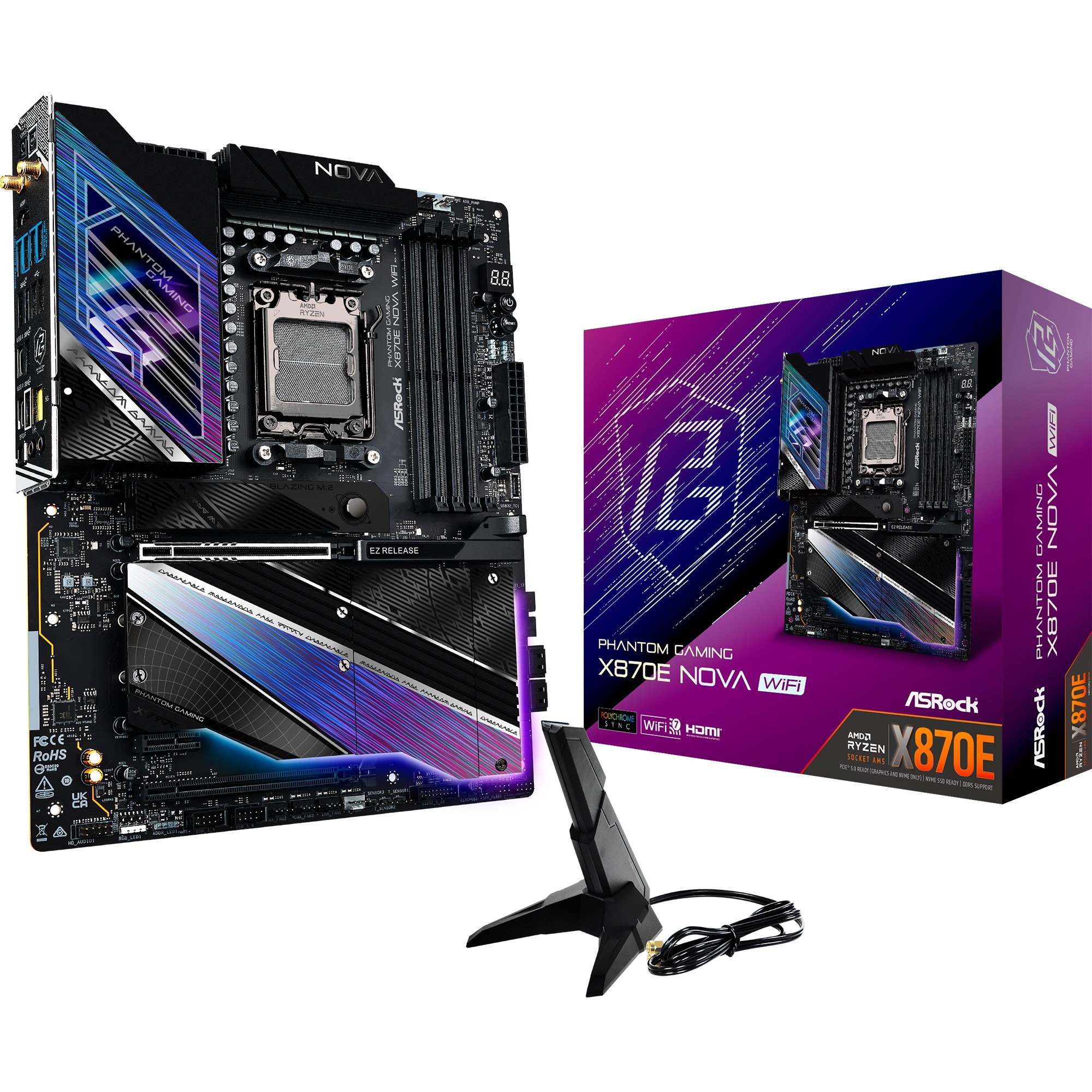 L’ASRock X870E Nova WiFi est basée sur le chipset AMD X870E et supporte les processeurs AMD en socket AM5. Elle dispose de quatre emplacements DDR5 pouvant accueillir jusqu’à 256 Go de mémoire vive. L’ASRock X870E Nova WiFi est également équipée d’un slot PCIe 5.0 x16, d’un slot PCIe 3.0 x16 (x2 lanes) et d’un slot PCIe 3.0 x16 (x1 lanes). L’ASRock X870E Nova WiFi dispose également d’un son à 8 canaux, d’une interface LAN 5 Gigabit, de WiFi 7, de Bluetooth 5.4, de quatre ports SATA3, de cinq ports M.2, de deux ports USB-A 2.0, de trois ports USB-A 3.2 (5 Gbit/s), de cinq ports USB-A 3.2 (10 Gbit/s) et de deux ports USB 4.