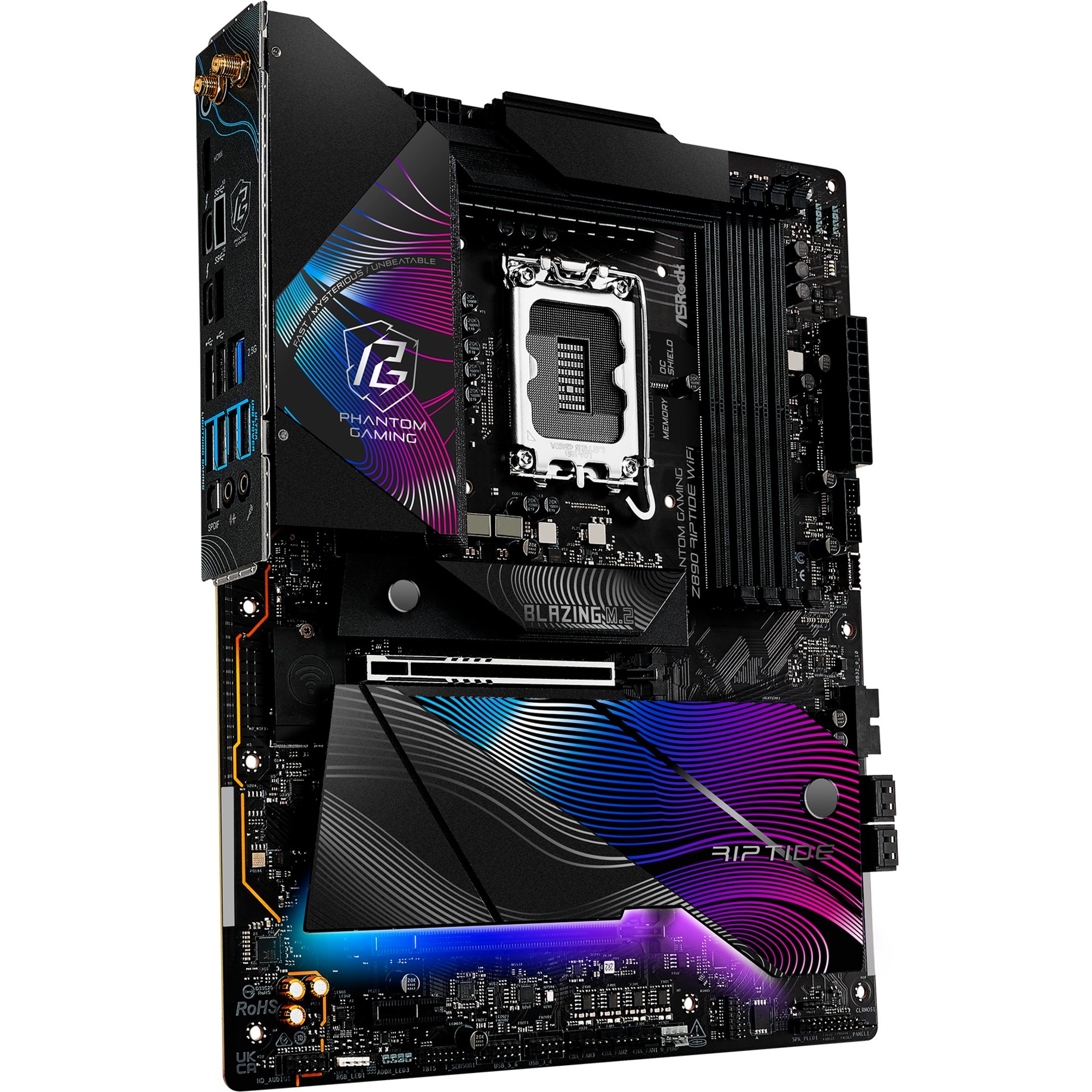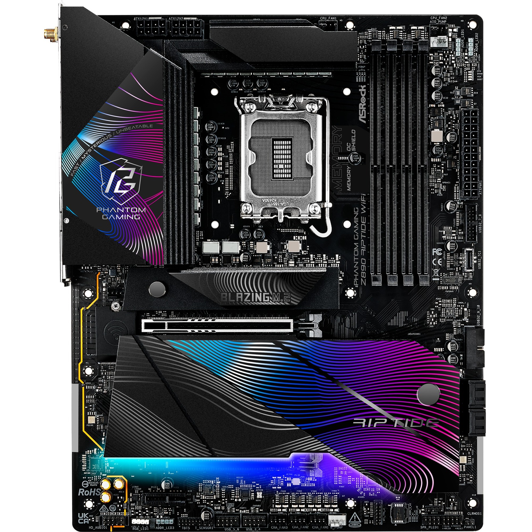 La ASRock Z890 Riptide WiFi est basée sur le chipset Intel® Z890 et supporte les processeurs Intel® sur le socket 1851. Elle dispose de quatre emplacements DDR5 pouvant accueillir jusqu’à 256 Go de mémoire vive. La carte ASRock Z890 Riptide WiFi dispose également d’un emplacement PCIe 5.0 x16, d’un emplacement PCIe 4.0 x16 (x4 voies) et d’un emplacement PCIe 4.0 x1. L’ASRock Z890 Riptide WiFi dispose également d’un son à 8 canaux, d’une interface LAN 2.5 Gigabit, de WiFi 7, de Bluetooth 5.4, de quatre ports SATA3, de cinq ports M.2, de quatre ports USB-A 3.2 (5 Gbit/s), de deux ports USB-A 3.2 (10 Gbit/s) et de deux interfaces Thunderbolt 4.