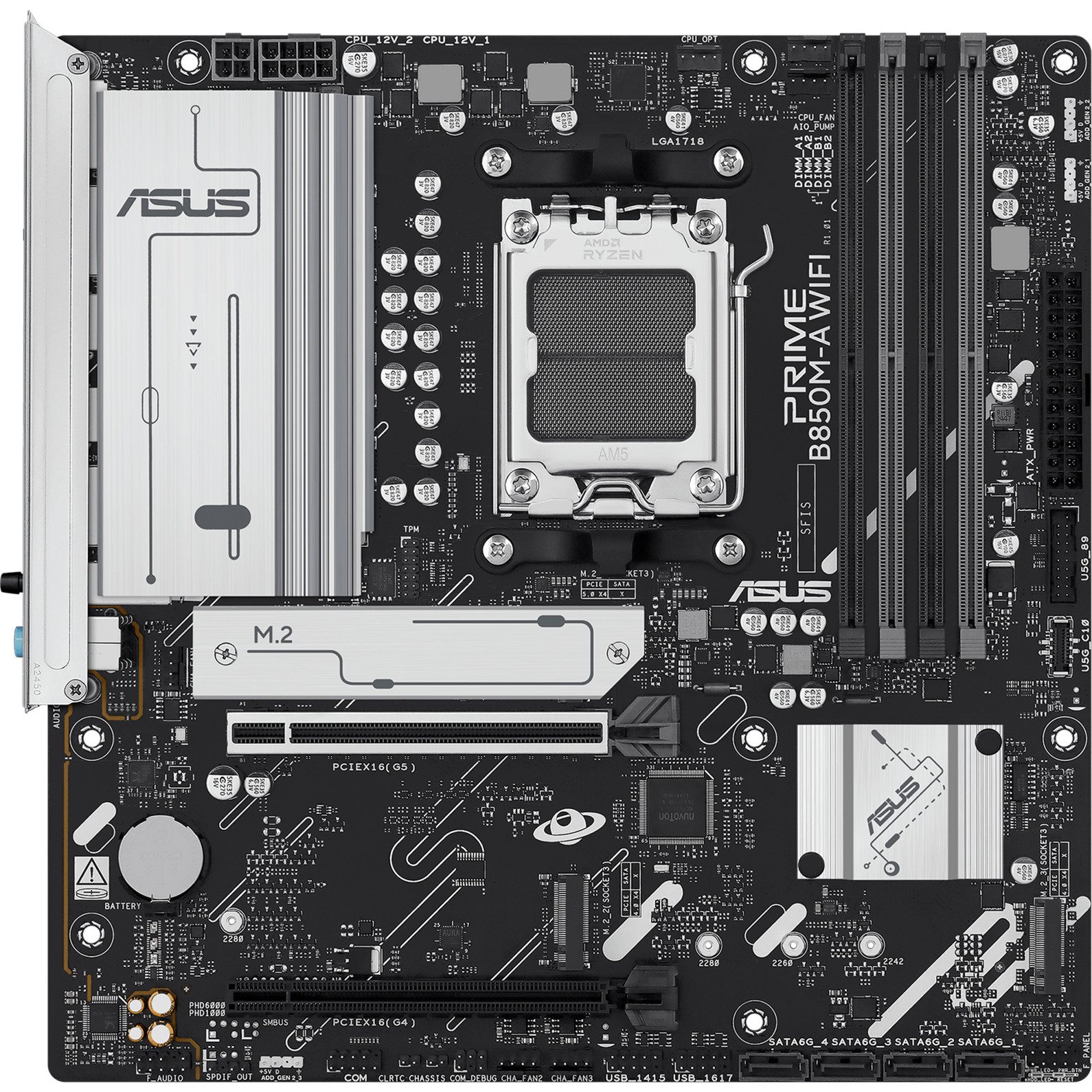 La carte mère ASUS PRIME B850M-A WIFI est basée sur le chipset AMD B850 et prend en charge les processeurs AMD avec un socket AM5. Cette carte mère dispose de quatre emplacements DIMM DDR5 double canal pour un maximum de 256 Go de RAM. Elle dispose également d’un emplacement PCIe 5.0 x16 et d’un emplacement PCIe 4.0 x16 (x4 Lanes). La carte mère ASUS PRIME B850M-A WIFI est équipée d’un son 8 canaux, d’une interface LAN 2,5 Gigabit, du Wi-Fi 6E, Bluetooth, quatre ports SATA3, trois ports M.2, quatre interfaces USB-A 2.0, deux interfaces USB-A 3.2 (5 Gbit/s) et deux interfaces USB-A 3.2 (10 Gbit/s).