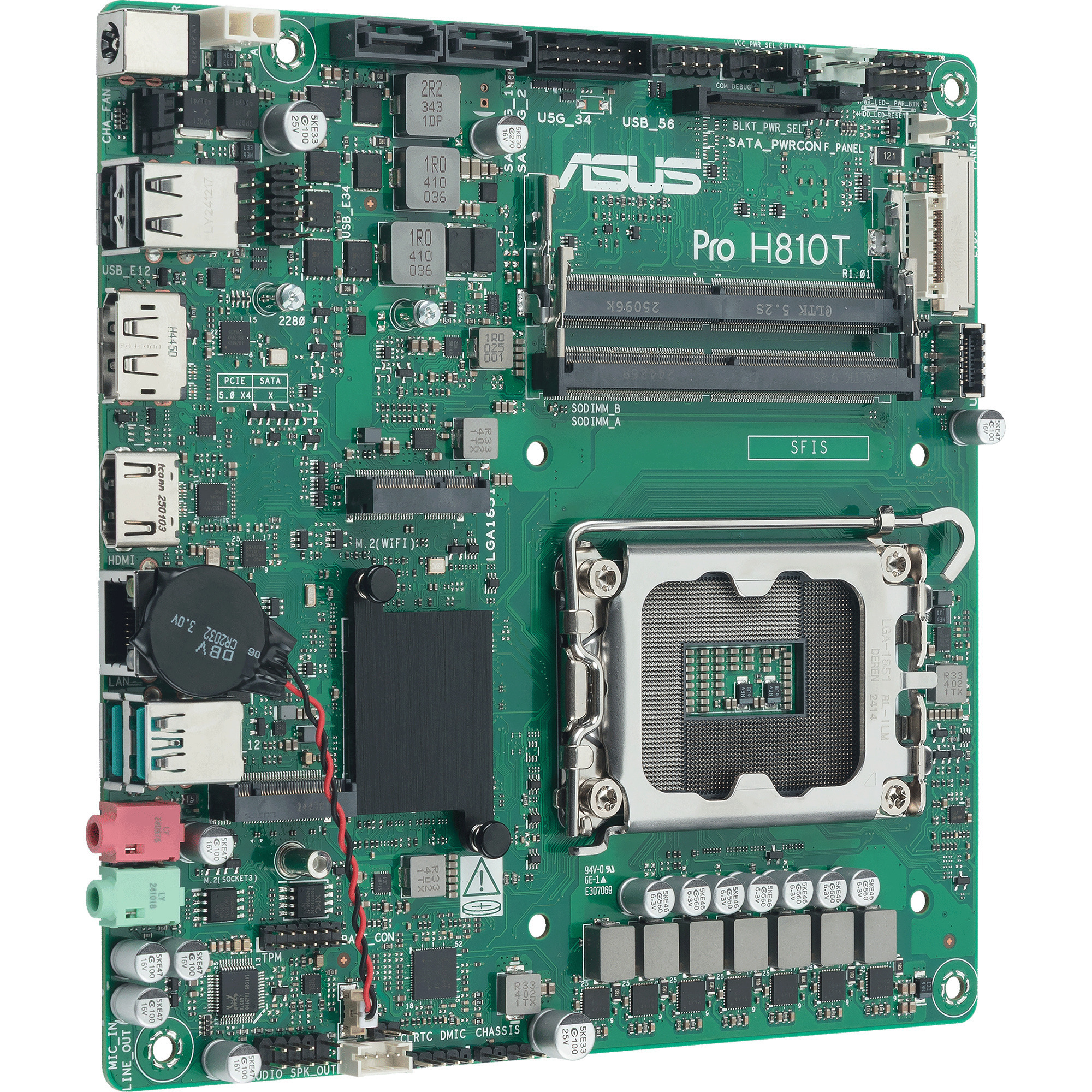 Basé sur le chipset Intel® H810, l’ASUS PRO H810T-CSM supporte les processeurs Intel® sur socket 1851 et dispose de deux slots DDR5 SO-DIMM pouvant accueillir jusqu’à 128 Go de mémoire vive. Le PRO H810T-CSM d’ASUS dispose d’un son HD, d’une interface LAN Gigabit, de deux ports SATA3, d’un port M.2 et d’une série d’interfaces USB.