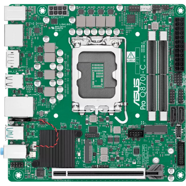 Basé sur le chipset Intel® Q870 et supportant les processeurs Intel® sur socket 1851, le PRO Q870I-C-CSM d’ASUS dispose de deux slots SODIMM DDR5 pouvant accueillir jusqu’à 128 Go de mémoire. Les autres caractéristiques de l’ASUS PRO Q870I-C-CSM incluent un slot PCIe 5.0-x16, un son 8 canaux, une interface LAN Gigabit, deux ports SATA3, un port M.2 et une série de ports USB.