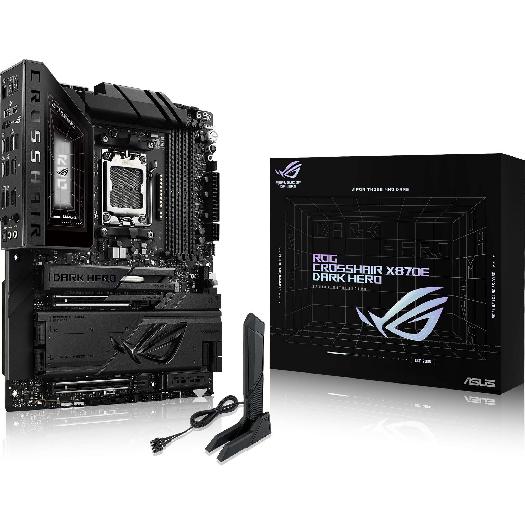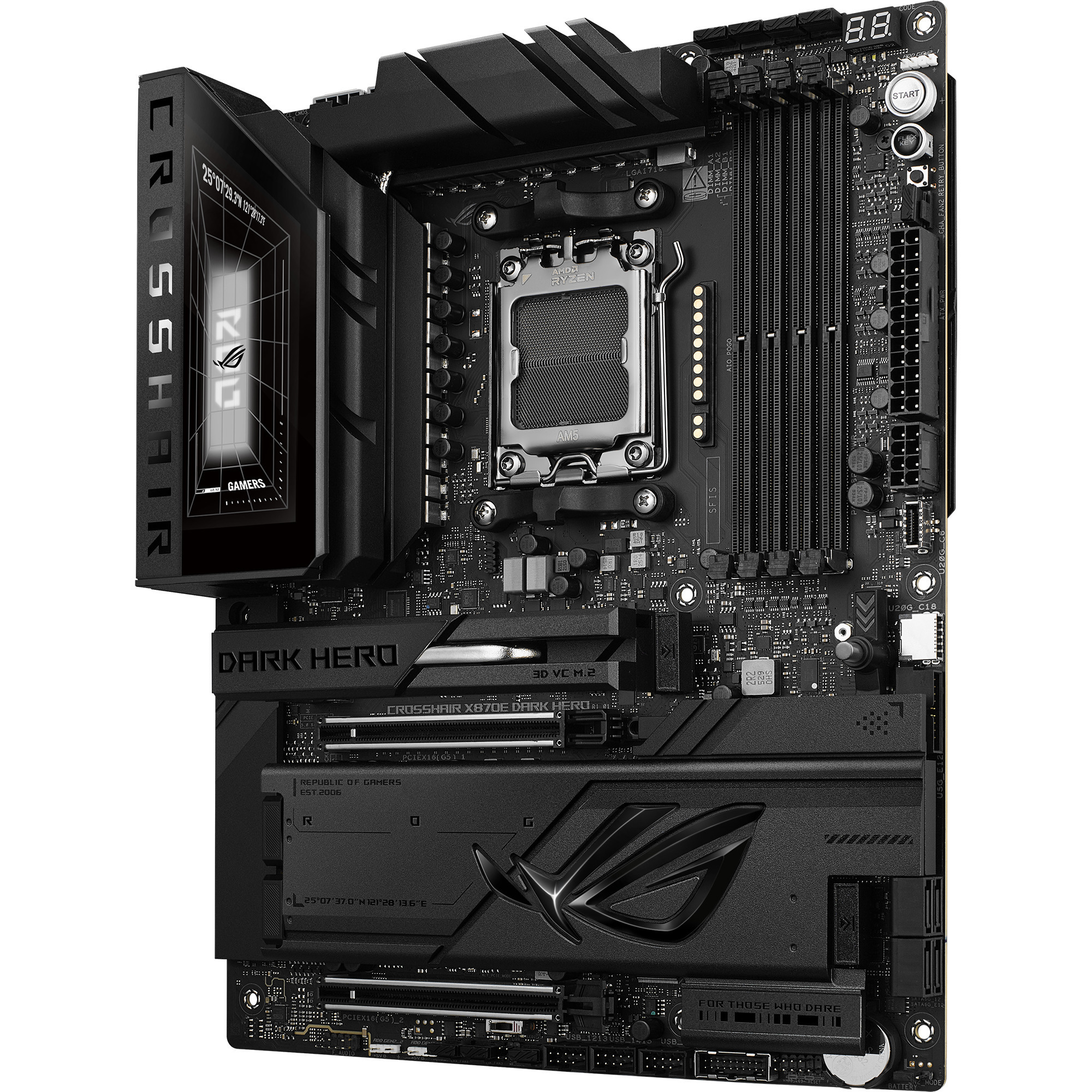 L’ASUS ROG CROSSHAIR X870E DARK HERO est basé sur la puce AMD X870E et prend en charge les processeurs AMD pour socket AM5. Il dispose de quatre emplacements DDR5 pouvant accueillir jusqu’à 256 Go de RAM. L’ASUS ROG CROSSHAIR X870E DARK HERO possède également un emplacement PCIe 5.0 x16 et un emplacement PCIe 4.0 x16 (x8 voies). De plus, l’ASUS ROG CROSSHAIR X870E DARK HERO propose un son 8 canaux, une interface LAN 10 Gigabits, une interface LAN 5 Gigabit, WiFi 7, Bluetooth 5.4, quatre ports SATA3, cinq ports M.2 et une gamme de ports USB.