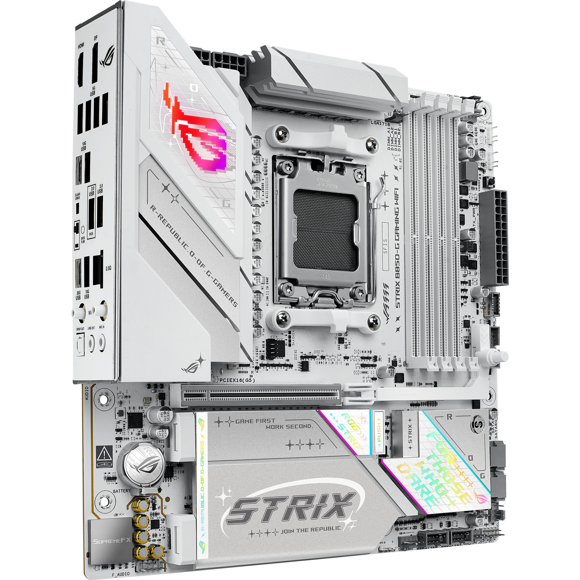 La carte mère ASUS ROG STRIX B850-G GAMING WIFI constitue une solution de premier choix pour les utilisateurs souhaitant bâtir une configuration performante dans un format compact. Conçue autour du socket AM5 et du chipset AMD B850, elle assure une compatibilité totale avec les processeurs Ryzen des séries 7000, 8000 et 9000, incluant les modèles X3D. Son facteur de forme mATX, avec des dimensions de 244 mm de largeur sur 305 mm de hauteur, permet une intégration aisée dans des boîtiers plus restreints sans sacrifier la puissance de traitement.