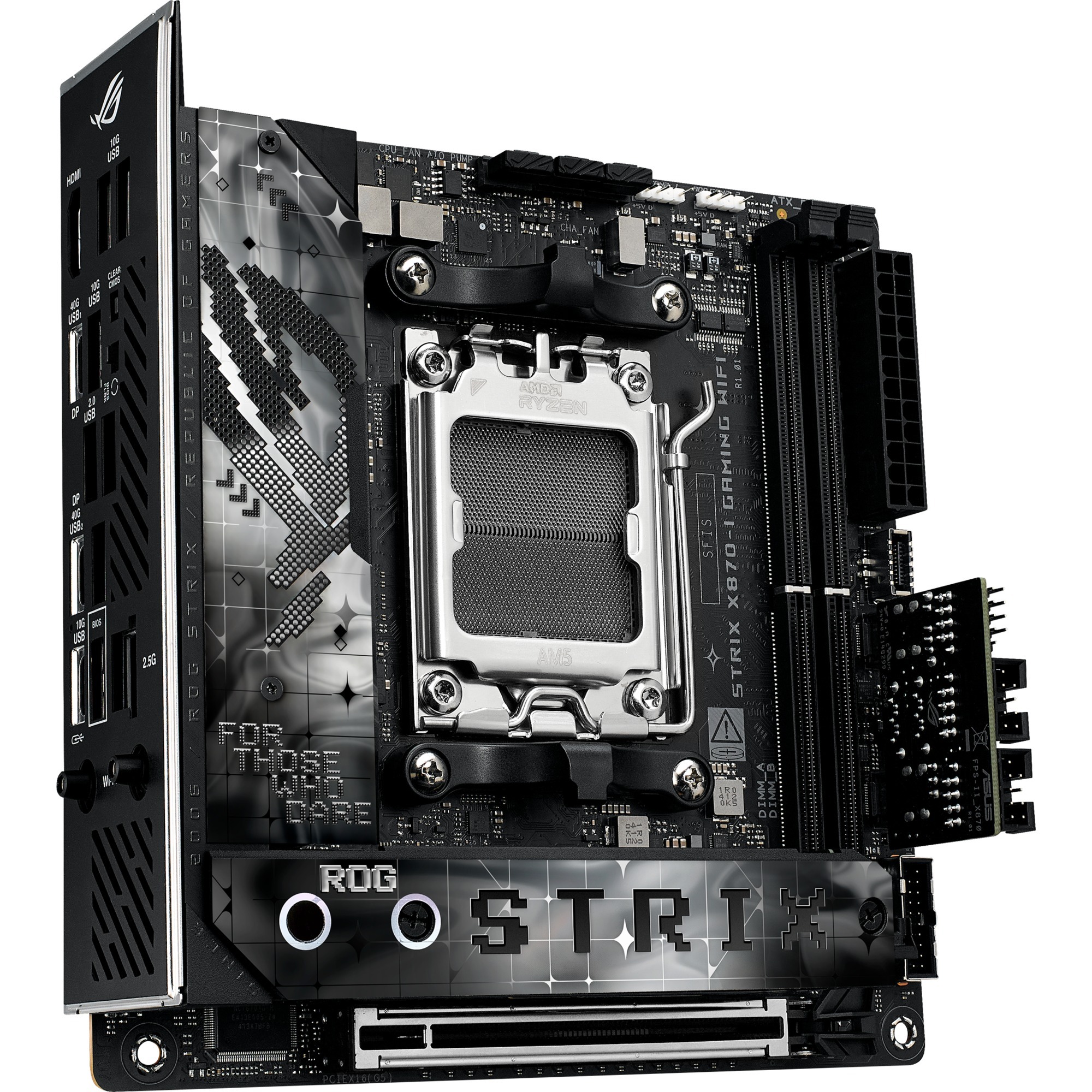 La carte mère ASUS ROG STRIX X870-I GAMING WIFI est basée sur le chipset AMD X870 et prend en charge les processeurs AMD sur socket AM5. Cette carte mère dispose de deux emplacements DIMM DDR5 à double canal pouvant accueillir jusqu’à 128 Go de mémoire vive. Les autres caractéristiques de la carte ASUS ROG STRIX X870-I GAMING WIFI comprennent un emplacement PCIe 5.0 x16 et un emplacement PCIe 4.0 x16. En outre, l’ASUS ROG STRIX X870-I GAMING WIFI dispose d’un son à 8 canaux, d’une interface LAN 2,5 Gigabit, Wi-Fi 7, Bluetooth, de deux ports SATA3, de deux ports M.2, de trois interfaces USB-A 2.0, de quatre interfaces USB-A 3.2 (10 Gbit/s), de deux interfaces USB 4 et d’une interface USB-C 3.2 (10 Gbit/s).