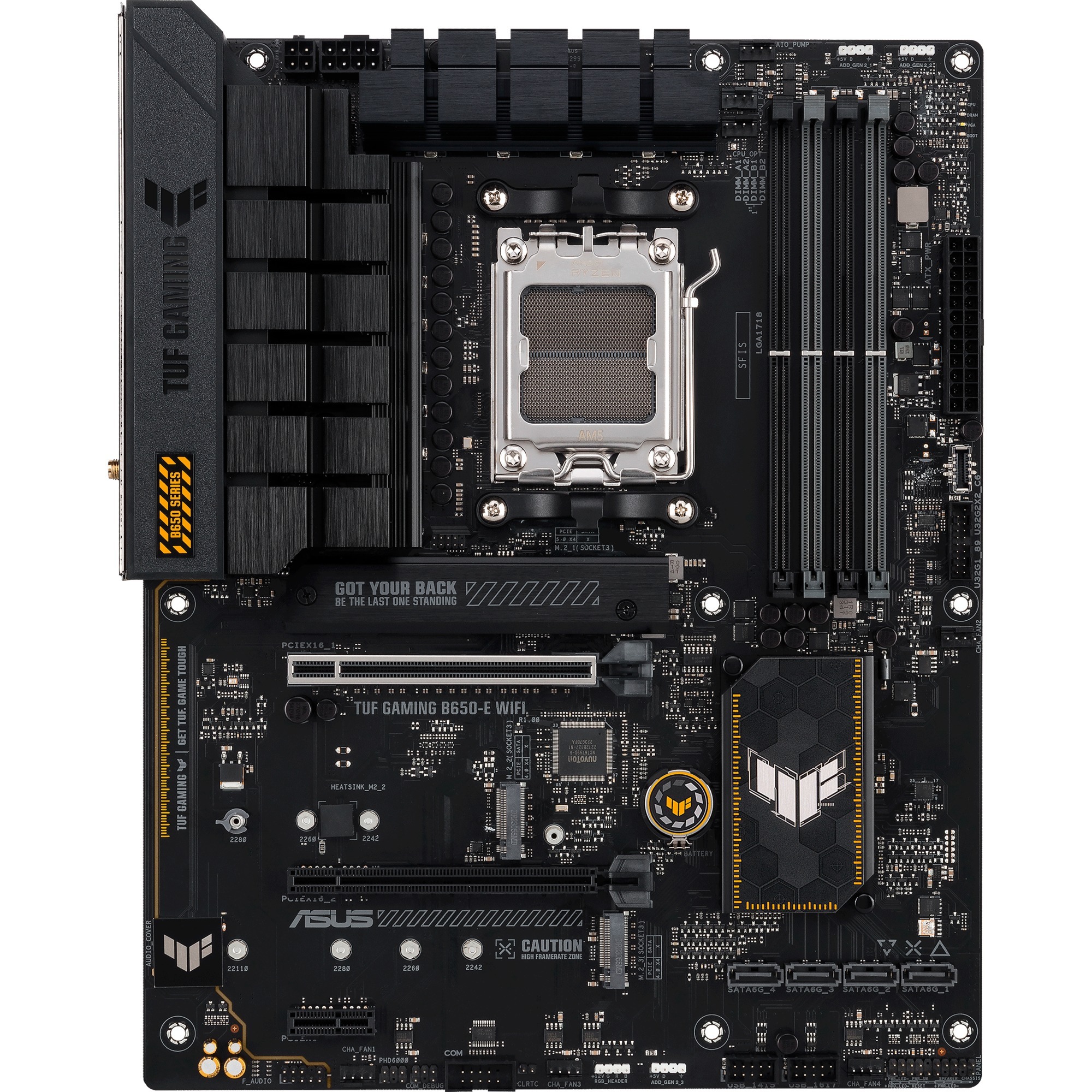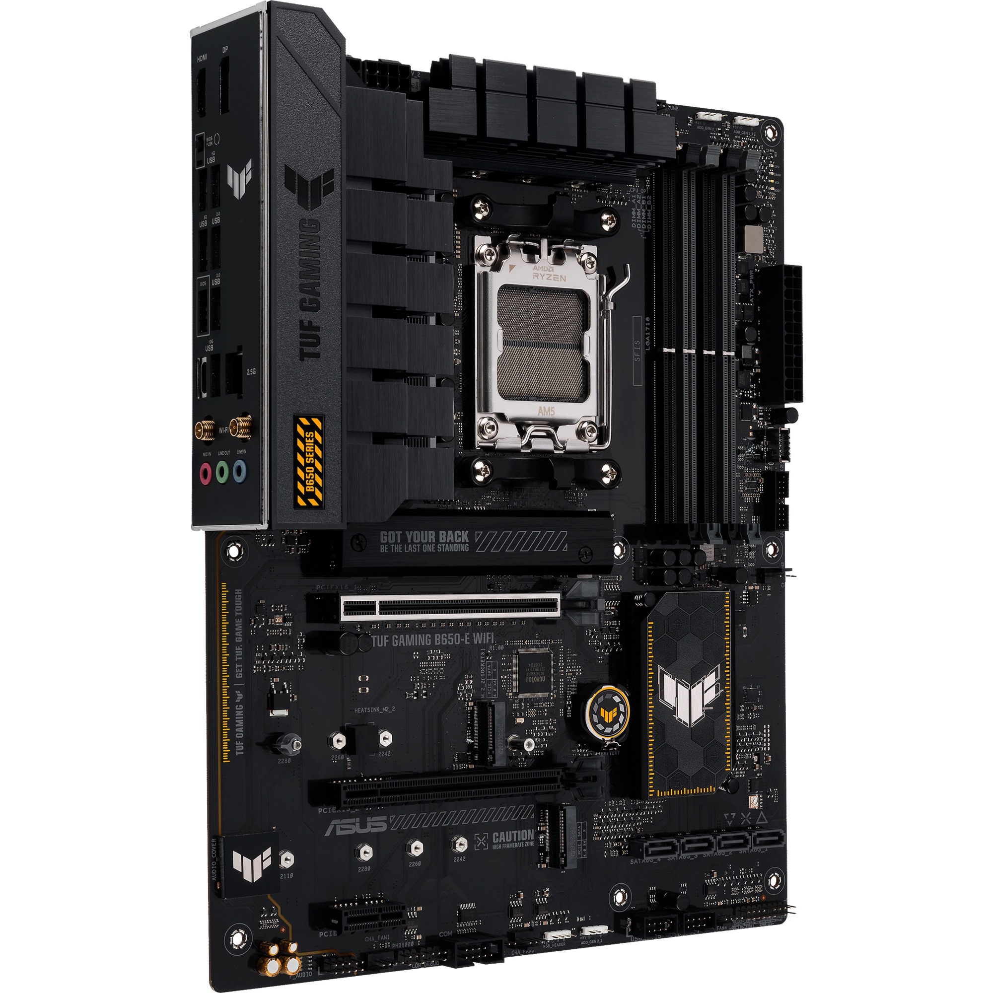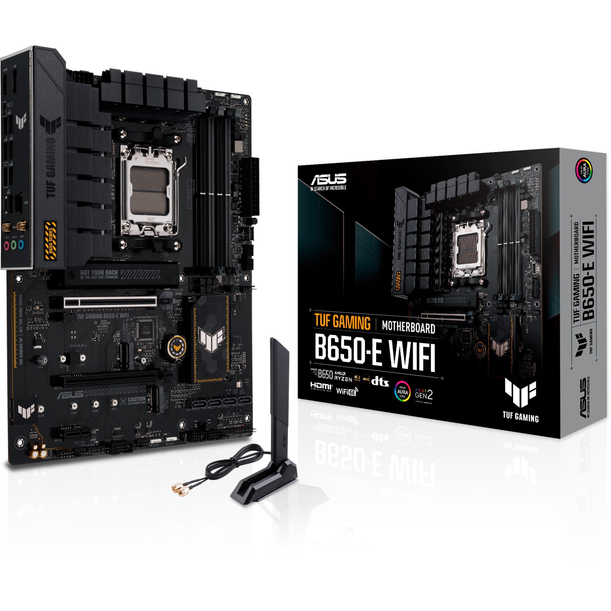 La carte mère TUF GAMING B650-E WIFI d’ASUS est basée sur le chipset AMD B650 et prend en charge les processeurs AMD sur le socket AM5. Elle dispose de quatre emplacements DIMM DDR5 en mode dual-channel pour un maximum de 192 Go de mémoire vive. La TUF GAMING B650-E WIFI est également équipée d’un emplacement PCIe 4.0 x16 et de deux emplacements PCIe 4.0 x1. La TUF GAMING B650-E WIFI dispose également d’un son à 8 canaux, d’une interface LAN 2.5 Gigabit, de quatre ports SATA3, de trois ports M.2, Wi-Fi 6E, Bluetooth, quatre interfaces USB-A 2.0, deux interfaces USB-A 3.2 (5 Gbit/s), une interface USB-A 3.2 (10 Gbit/s) et une interface USB-C 3.2 (10 Gbit/s).ASUS TUF GAMING B650-E WIFI reprend tous les éléments essentiels du dernier socket AM5 pour les processeurs de bureau AMD Ryzen™ et les associe à des fonctionnalités prêtes pour le jeu et à une durabilité éprouvée. Conçue avec des composants de qualité militaire, une solution d’alimentation améliorée et un système de refroidissement complet, cette carte mère dépasse les attentes avec des performances solides comme le roc et stables pour les jeux marathon. Les cartes mères TUF GAMING sont également soumises à des tests d’endurance rigoureux pour s’assurer qu’elles peuvent faire face à des conditions où d’autres pourraient échouer. Esthétiquement, ce modèle incorpore des éléments de design robustes, noirs et géométriques pour refléter la fiabilité et la stabilité qui caractérisent la série TUF GAMING.