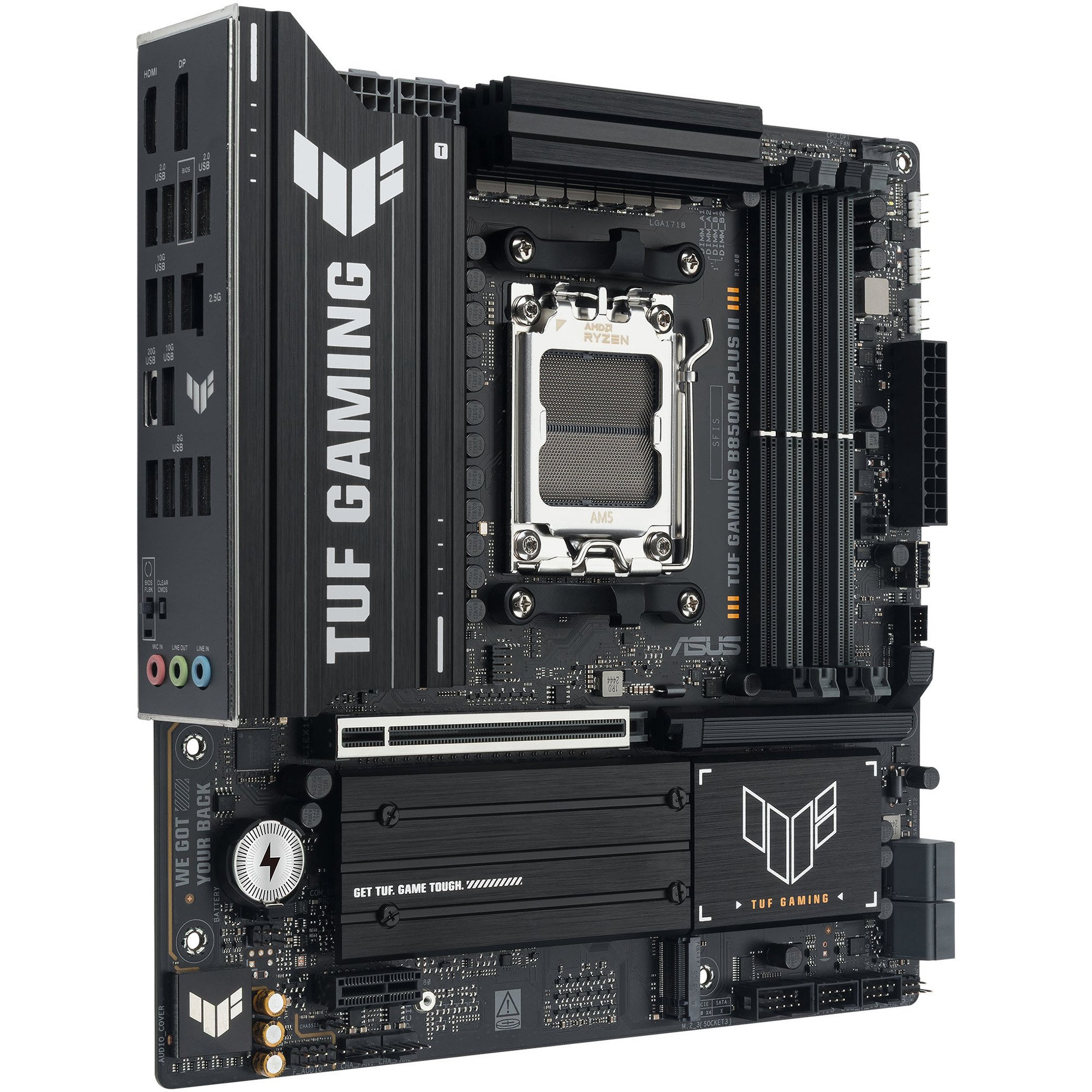 L’ASUS TUF GAMING B850M-PLUS II se positionne comme une pierre angulaire pour votre future configuration basée sur le socket AM5. Conçue pour accueillir les processeurs AMD Ryzen des séries 7000, 8000 et les récents 9000, cette carte mère au format Micro-ATX de 244 mm par 244 mm exploite le chipset B850. Elle offre une robustesse caractéristique de la gamme TUF, soutenue par une alimentation EPS12V 2.9x utilisant un connecteur principal de 24 broches complété par deux connecteurs de 8 broches pour une stabilité électrique optimale.
