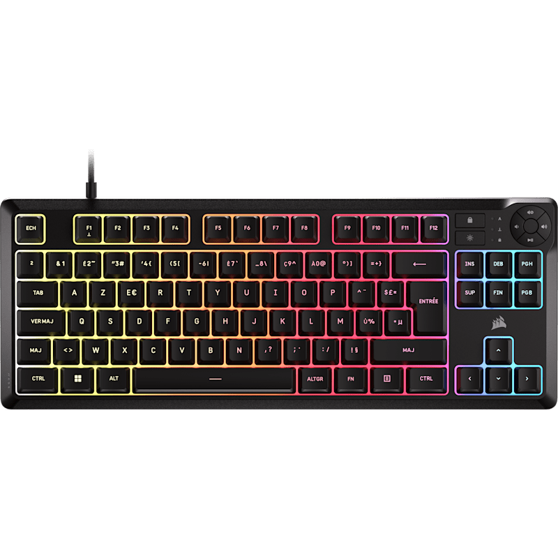 Le clavier de jeu CORSAIR K55 CORE TKL est un clavier à membrane sans touches, résistant aux éclaboussures et élégant, qui supprime le pavé numérique pour donner aux joueurs plus d’espace pour réaliser des jeux importants.