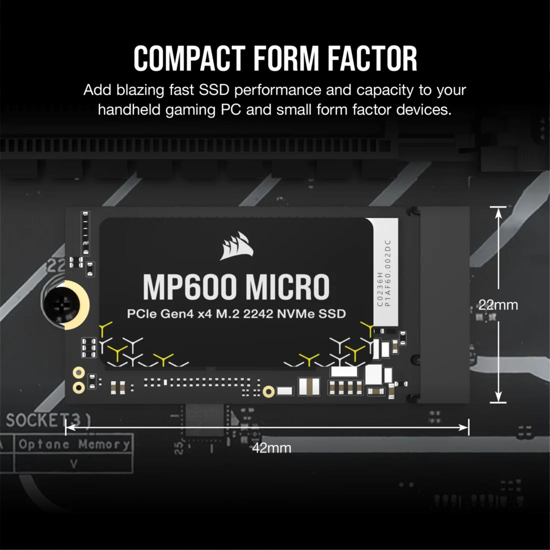 Le SSD Corsair MP600 MICRO offre d’excellentes performances de stockage dans un format minuscule, idéal pour les appareils fins et légers. Grâce à la technologie PCIe Gen4, qui propose des vitesses de lecture et d’écriture élevées, il ne devrait manquer dans aucun PC gaming portable.
