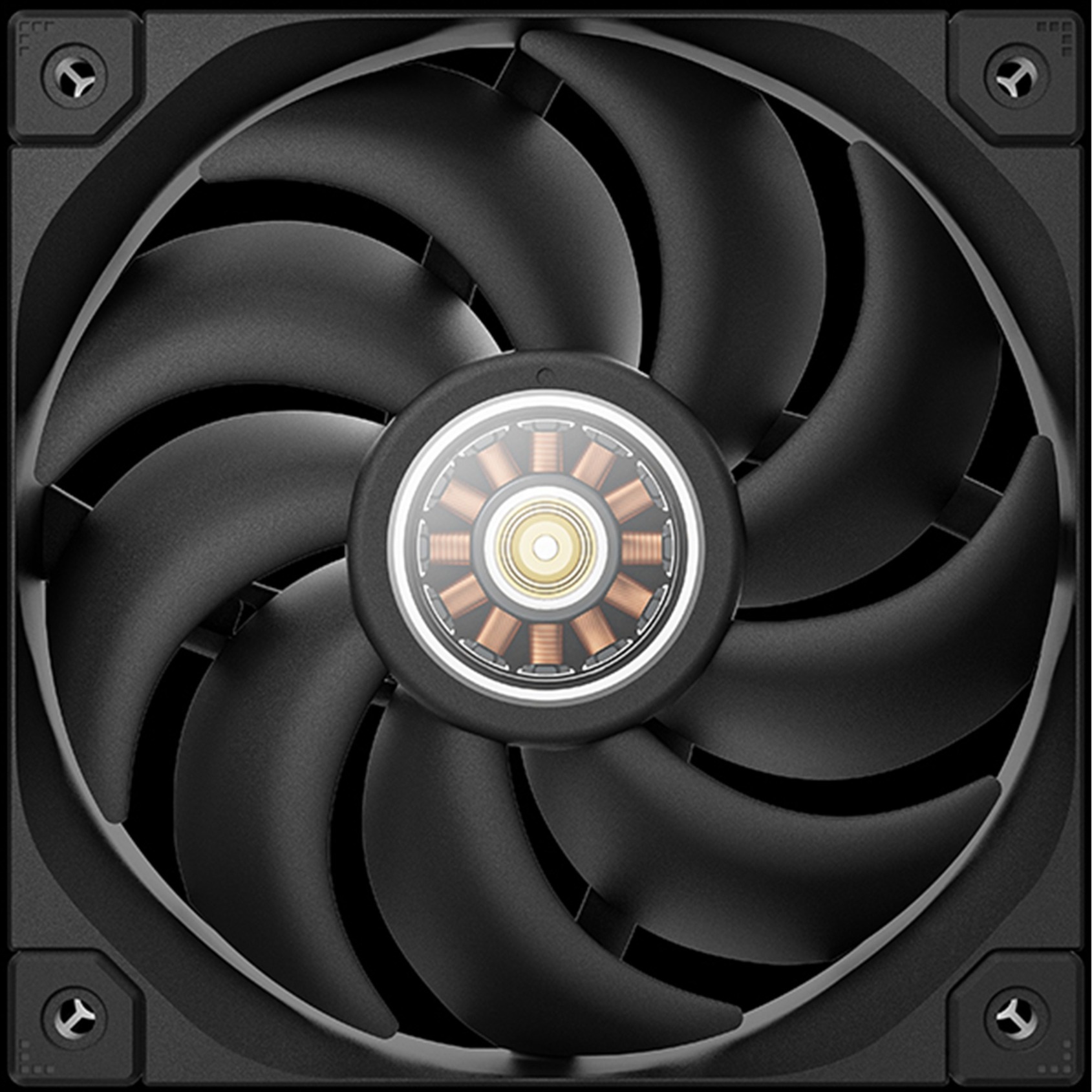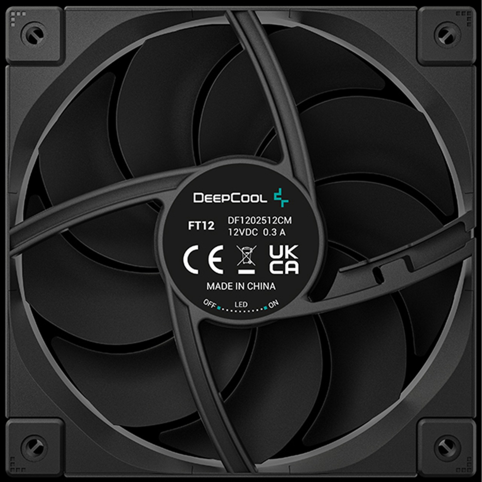 Le ventilateur de boîtier noir DeepCool FT12 120 mm est équipé d’un puissant moteur FOC triphasé, 10 pôles, 12 fentes avec contrôle en boucle fermée et aimants MQ de haute qualité. Chaque ventilateur FT12 est doté d’une fenêtre qui révèle la technologie de haute qualité du moteur du ventilateur et du palier Fluid Dynamic authentique. Derrière le palier se trouvent des LED blanches discrètes qui éclairent chaque détail. Des tampons en caoutchouc sur toute la surface et dans tous les coins minimisent les vibrations et le bruit causé par une pression de contact inégale.