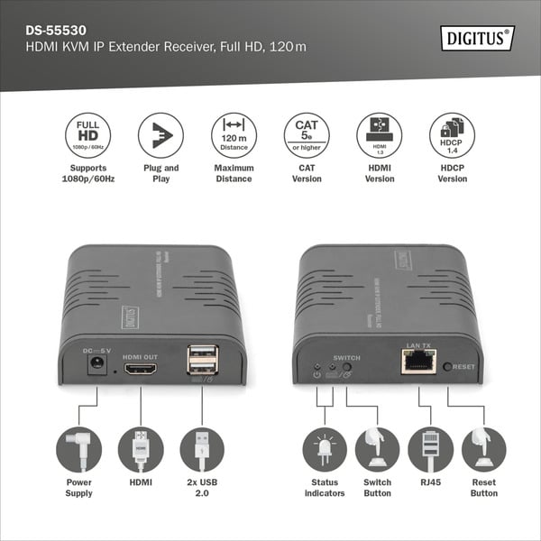 L’unité réceptrice (DS-55530) permet d’étendre le Set Extendeur KVM IP HDMI (DS-55529) avec des unités réceptrices supplémentaires.