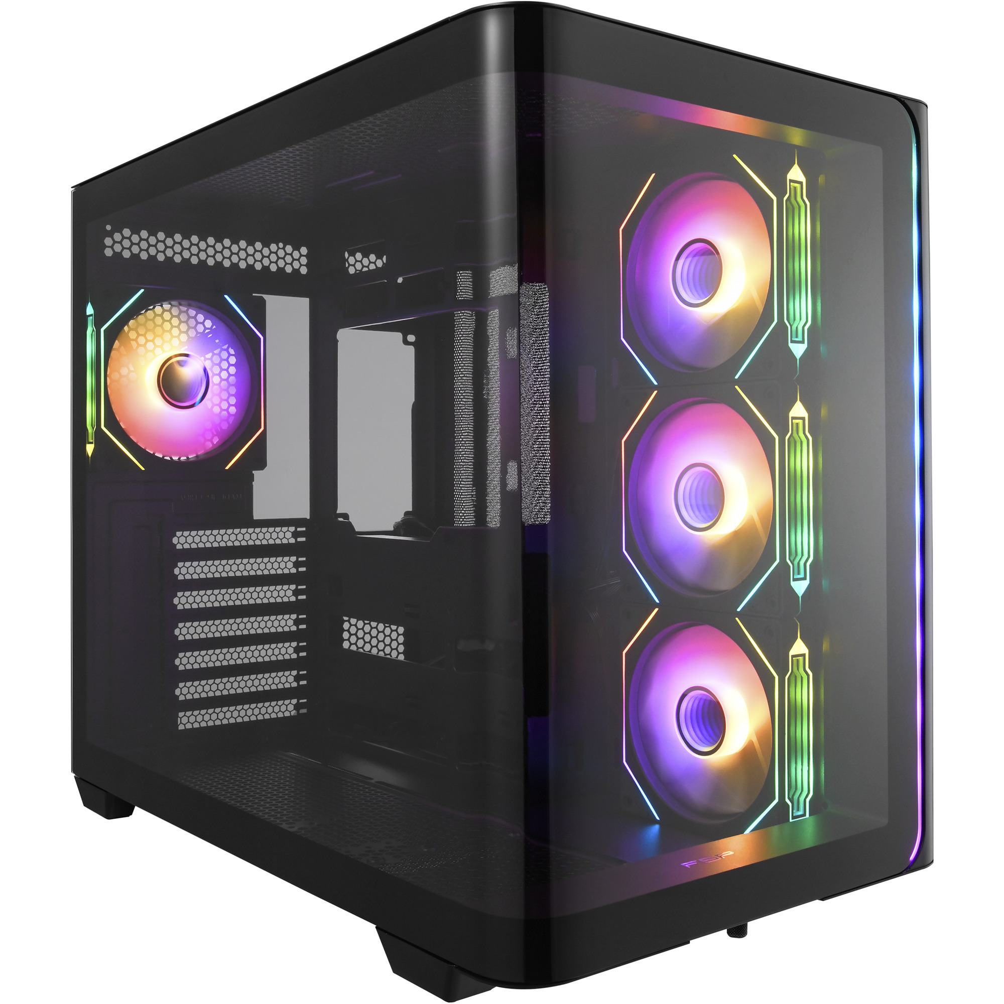 Doté d’un design panoramique en verre trempé et d’un chanfrein arrondi, le FSP M580 offre un extérieur exclusif qui met en valeur le potentiel de votre système tout en améliorant continuellement l’atmosphère de jeu. Équipée de quatre ensembles de puissants ventilateurs ARGB, tous contrôlables depuis la carte mère, cette configuration offre des effets de lumière époustouflants, tandis qu’un refroidissement optimisé offre des performances et une stabilité maximales du système. Le côté dispose de trois ventilateurs ARGB inversés avec contrôleurs PWM, tandis que l’arrière est équipé d’un ventilateur PWM ARGB. Le boîtier M580 prend en charge les cartes mères ATX (back-connect motherboard), M-ATX et Mini-ITX, et accueille des cartes graphiques jusqu’à 445 mm et des radiateurs jusqu’à 360 mm, offrant ainsi la flexibilité nécessaire pour une expérience de jeu immersive et sans restriction. Le M580 offre un design spacieux, offrant de l’espace pour tout votre équipement actuel tout en laissant de la place pour de futures mises à niveau.