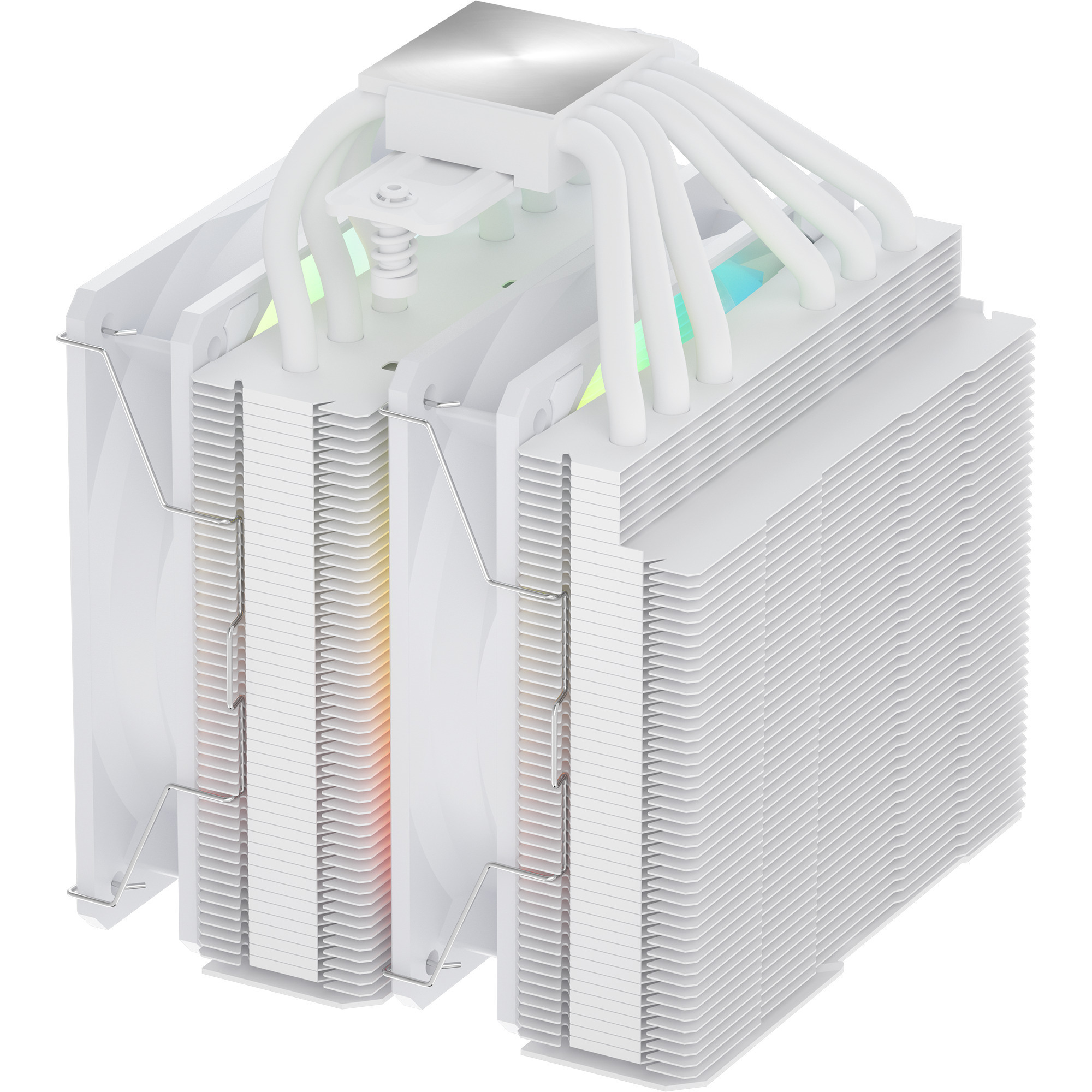 Le MP7-WA de FSP s’attaque aux températures trop élevées du processeur avec six caloducs et deux ventilateurs ARGB de 120 mm. Ce refroidisseur de processeur tour s’appuie sur un dissipateur thermique dans un boîtier élégant, une compatibilité élevée avec une grande variété de modules de RAM et une installation facile.