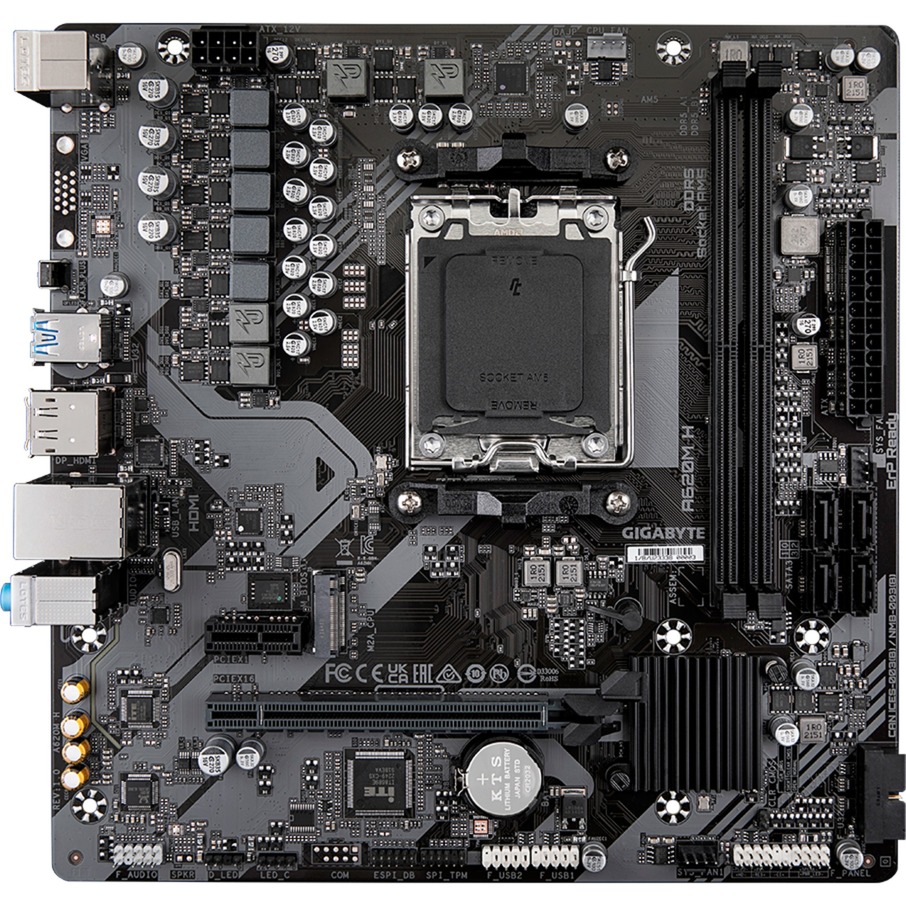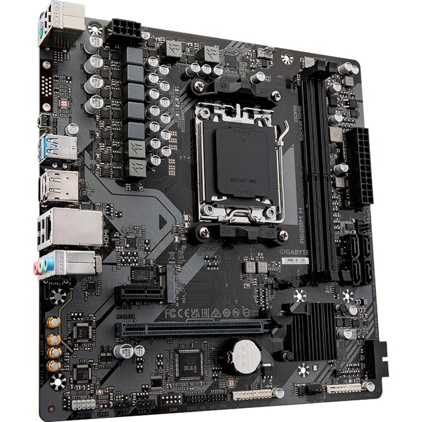 Le GIGABYTE A620M H est basé sur le chipset AMD A620 et prend en charge les processeurs AMD pour socket AM5. Il dispose de deux emplacements DDR5 pour jusqu’à 96 Go de RAM. Le GIGABYTE A620M H dispose également d’un slot PCIe 4.0 x16 et d’un slot PCIe 3.0 x1. De plus, le GIGABYTE A620M H dispose d’un son à 8 canaux, d’une interface LAN Gigabit, de quatre ports SATA3, d’un port M.2, de sorties graphiques dépendantes du processeur pour DisplayPort et HDMI, et d’une gamme de ports USB.