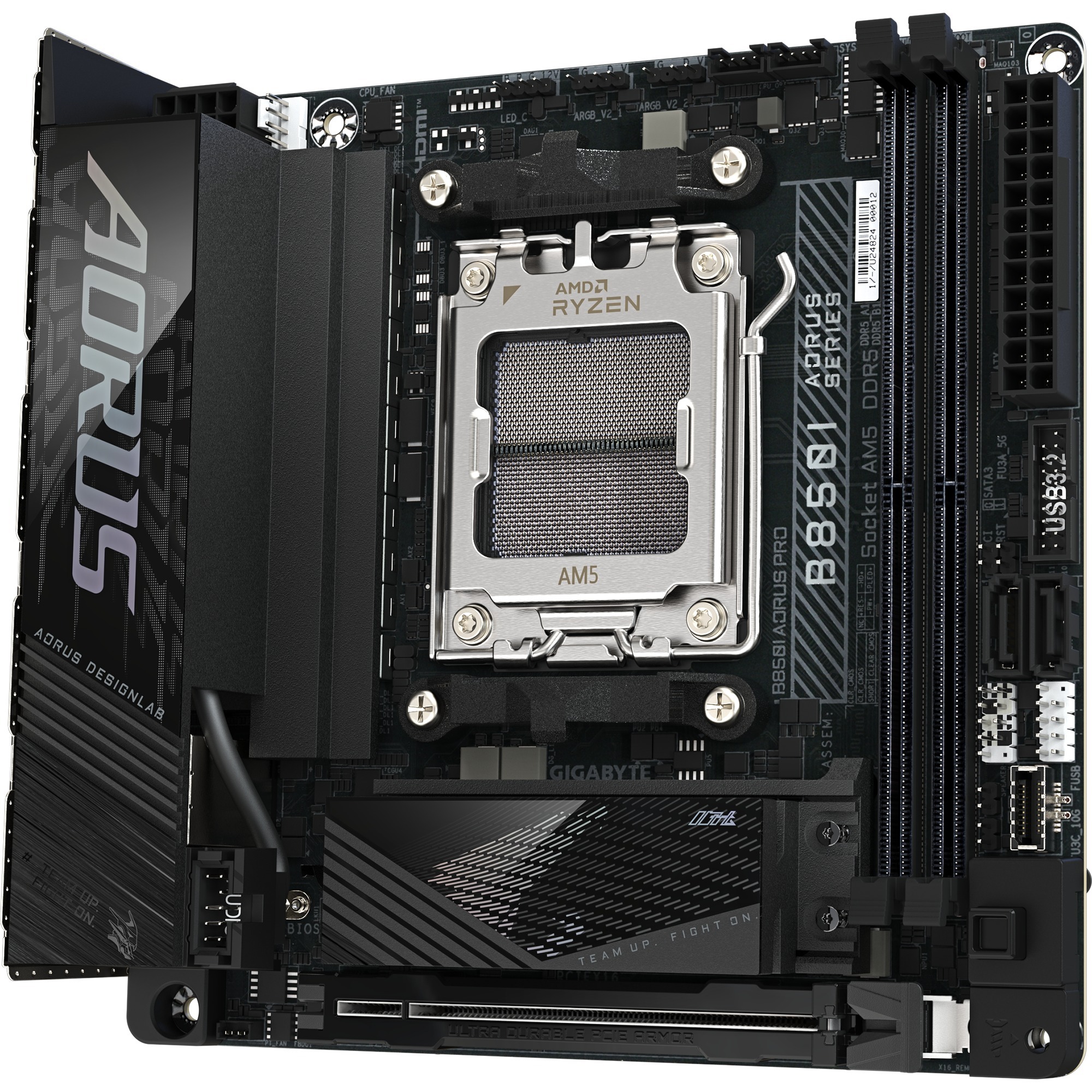 La carte mère GIGABYTE B850I AORUS PRO est basée sur le chipset AMD B850 et prend en charge les processeurs AMD avec un socket AM5. Cette carte mère dispose de deux emplacements DIMM DDR5 à double canal pouvant accueillir jusqu’à 128 Go de mémoire vive. Elle dispose également d’un emplacement PCIe 5.0 x16. La GIGABYTE B850I AORUS PRO dispose d’un son à 8 canaux, d’une interface LAN à 2,5 gigabits, Wi-Fi 7, Bluetooth, de deux ports SATA3, de deux ports M.2, de deux interfaces USB-A 2.0, de deux interfaces USB-A 3.2 (5 Gbit/s), de deux interfaces USB-A 3.2 (10 Gbit/s) et d’une interface USB-C 3.2 (10 Gbit/s).
