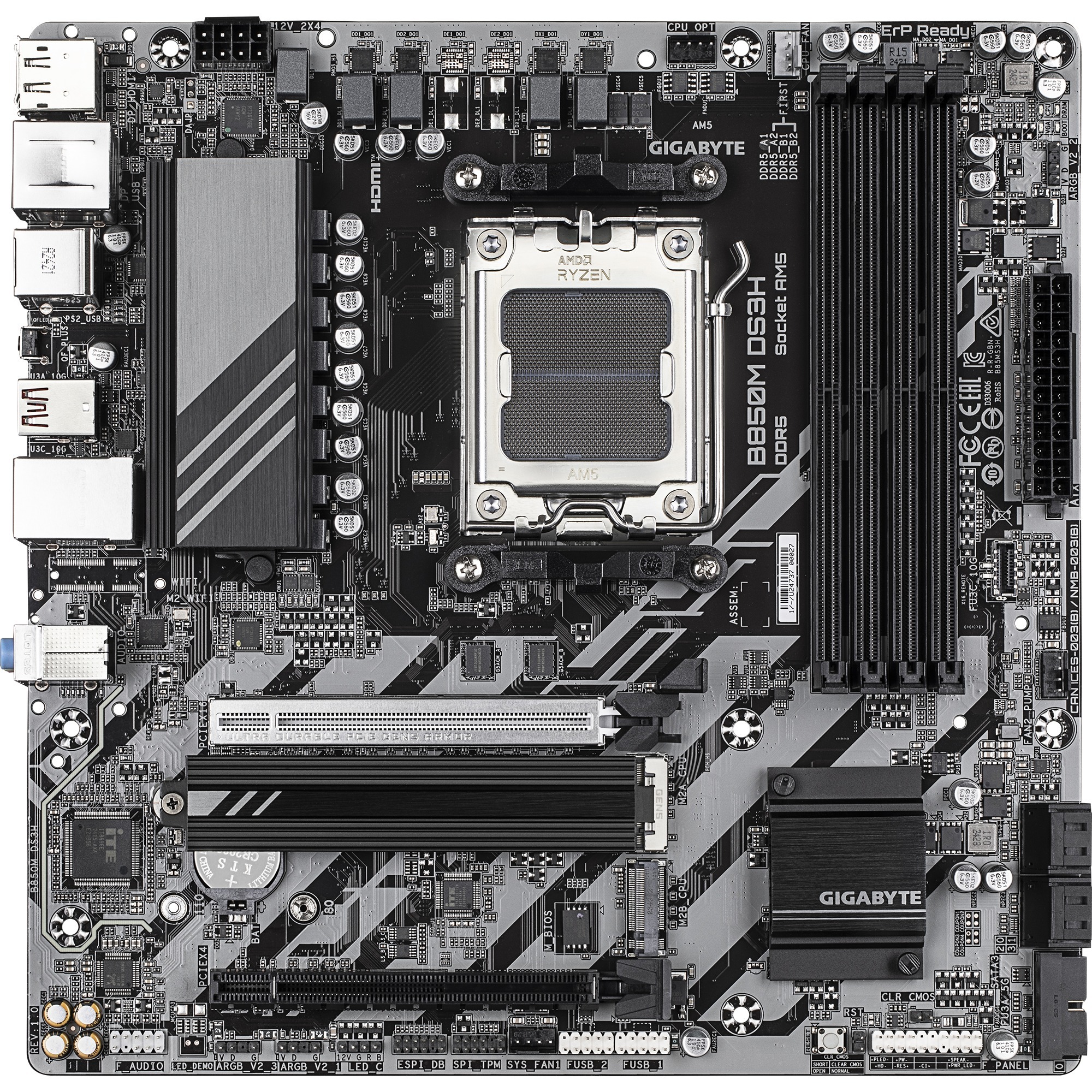 La carte mère GIGABYTE B850M DS3H est basée sur le chipset AMD B850 et prend en charge les processeurs AMD avec un socket AM5. Cette carte mère dispose de quatre emplacements DIMM DDR5 à double canal pouvant accueillir jusqu’à 128 Go de mémoire vive. D’autres caractéristiques incluent une solution graphique dépendante du CPU et deux emplacements PCIe 4.0 x16. La GIGABYTE B850M DS3H dispose d’un son à 8 canaux, d’une interface LAN à 2,5 gigabits, du Wi-Fi 6E, du Bluetooth, de quatre ports SATA3, de deux ports M.2, de quatre interfaces USB-A 2.0, de deux interfaces USB-A 3.2 (5 Gbit/s), de trois interfaces USB-A 3.2 (10 Gbit/s) et d’une interface USB-C 3.2 (10 Gbit/s).
