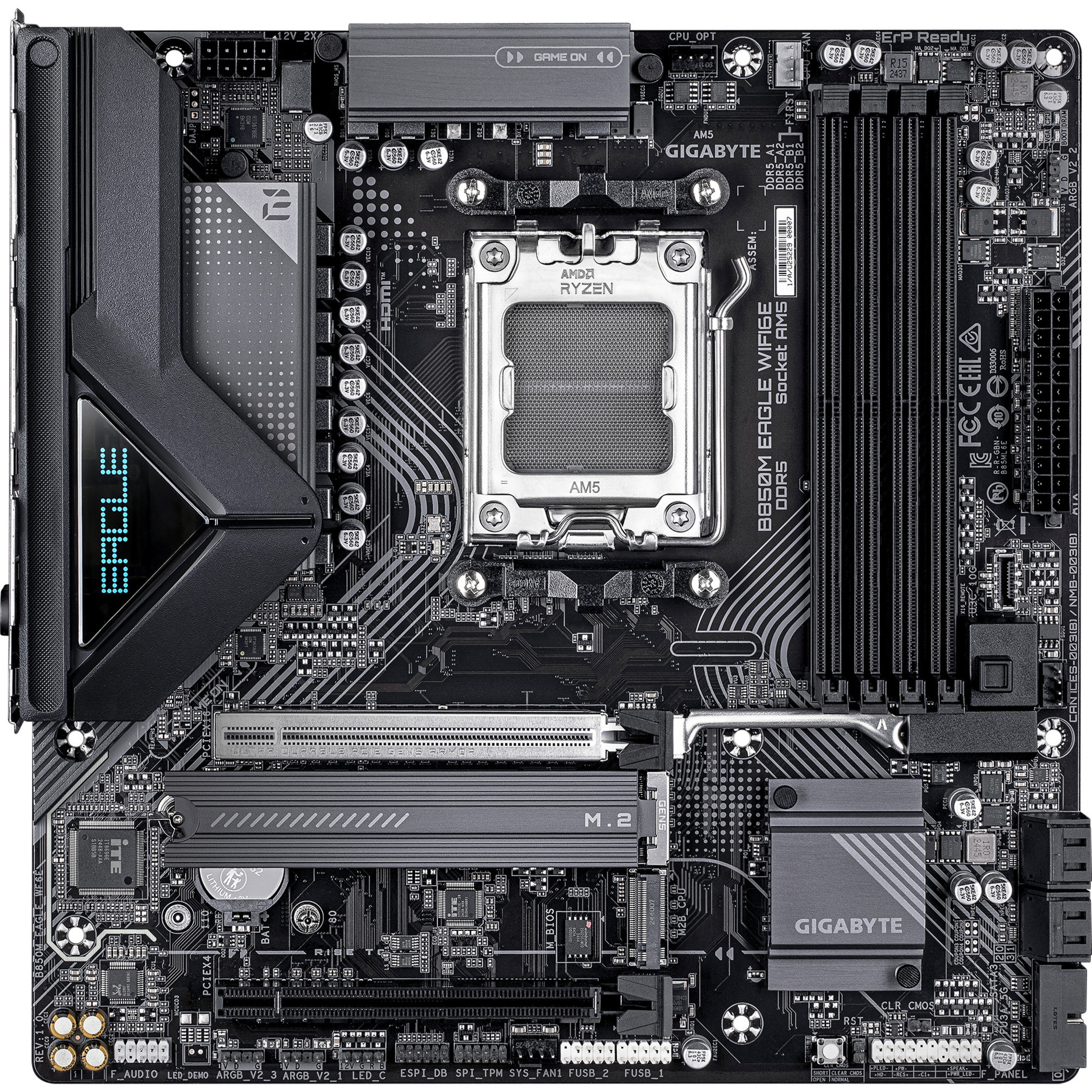Le GIGABYTE B850M EAGLE WIFI6E est basé sur le chipset AMD B850 et supporte les processeurs AMD pour le socket AM5. Il dispose de quatre slots DDR5 pouvant accueillir jusqu’à 256 Go de mémoire vive. Le GIGABYTE B850M EAGLE WIFI6E est également équipé d’un slot PCIe 5.0-x16 et d’un slot PCIe 3.0-x16 (x4 voies). De plus, le GIGABYTE B850M EAGLE WIFI6E dispose d’un son à 8 canaux, d’une interface LAN Gigabit, de quatre ports SATA3, du WiFi6E, du Bluetooth, de deux ports M.2 et d’une série d’interfaces USB.