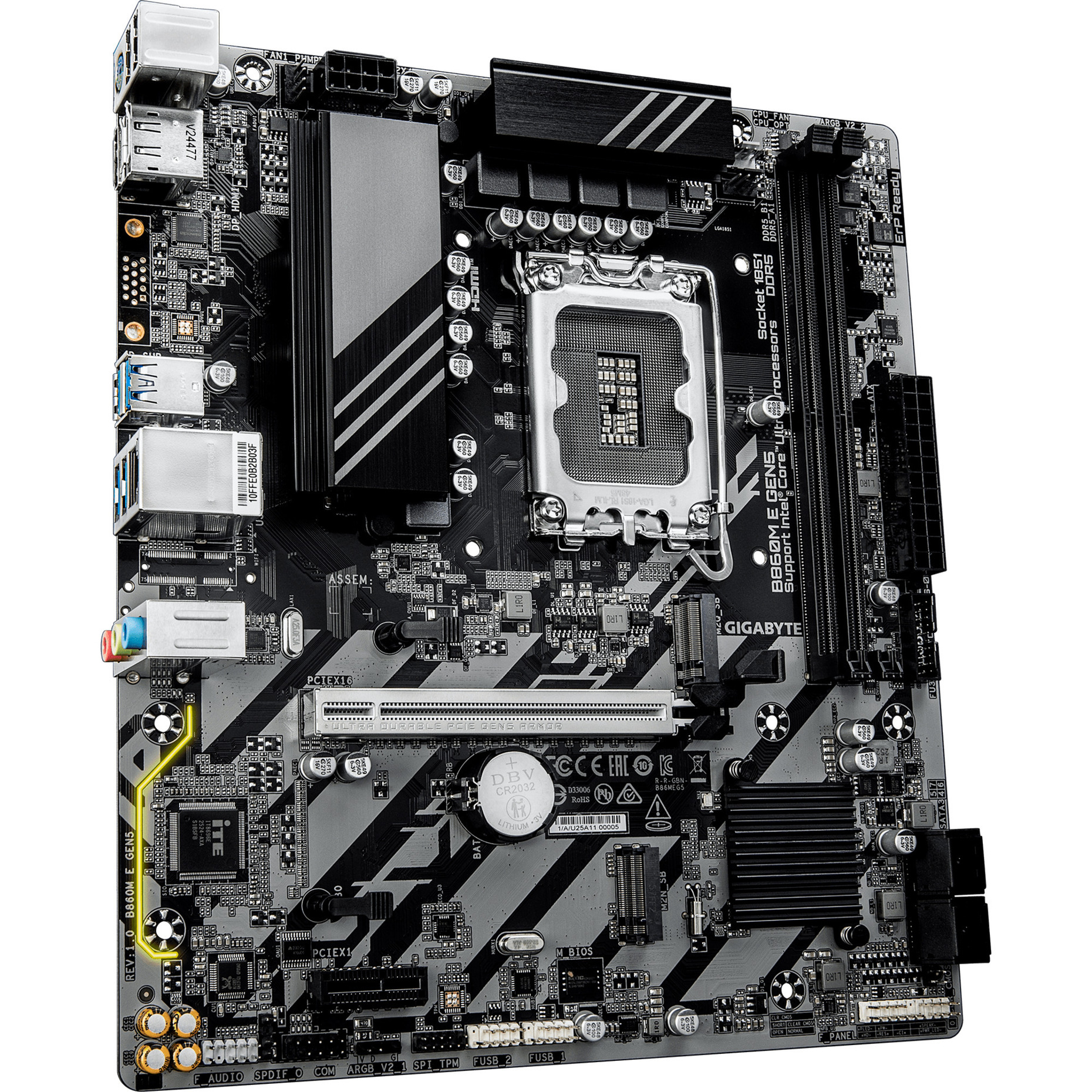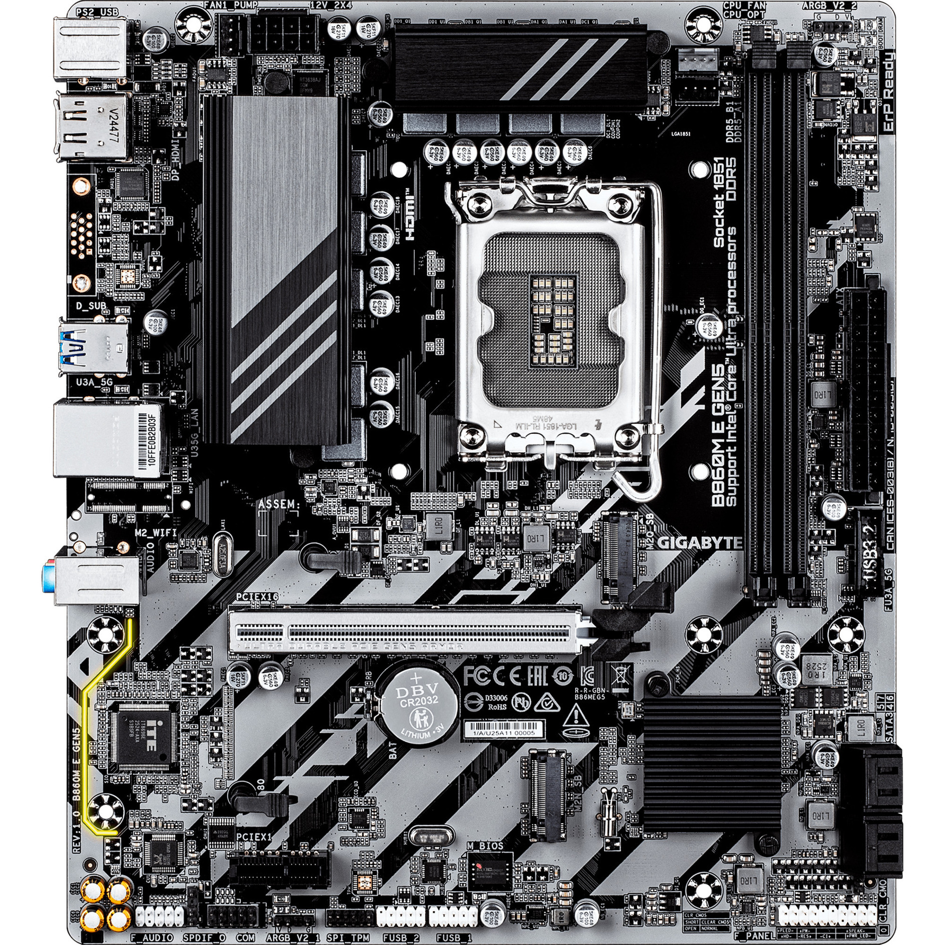 Le GIGABYTE B860M E est basé sur le chipset Intel® B860 et supporte les processeurs Intel® pour le socket 1851. Il dispose de quatre slots DDR5 pour jusqu’à 128 Go de mémoire vive. Le GIGABYTE B860M E est également équipé d’un slot PCIe 4.0-x16 et d’un slot PCIe 3.0-x1 (x4 voies). Le GIGABYTE B860M E dispose également d’un son à 8 canaux, d’une interface LAN Gigabit, de quatre ports SATA3, de deux ports M.2 et d’une série d’interfaces USB.