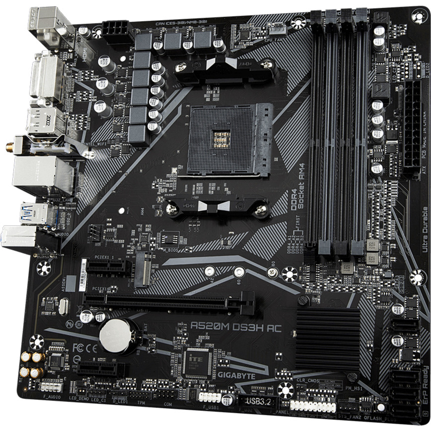 Le GIGABYTE A520M DS3H V2 est basé sur le chipset AMD A520 et supporte les processeurs AMD pour socket AM4. Il dispose de quatre emplacements DDR4 pour jusqu’à 128 Go de RAM. Les autres caractéristiques du GIGABYTE A520M DS3H V2 comprennent un emplacement PCIe 3.0 x16 et un emplacement PCIe 3.0 x1. De plus, le GIGABYTE A520M DS3H V2 dispose d’un son à 8 canaux, d’une interface LAN Gigabit, de quatre ports SATA3, du Wi-Fi 6, du Bluetooth, d’un port M.2 et d’une gamme de ports USB.