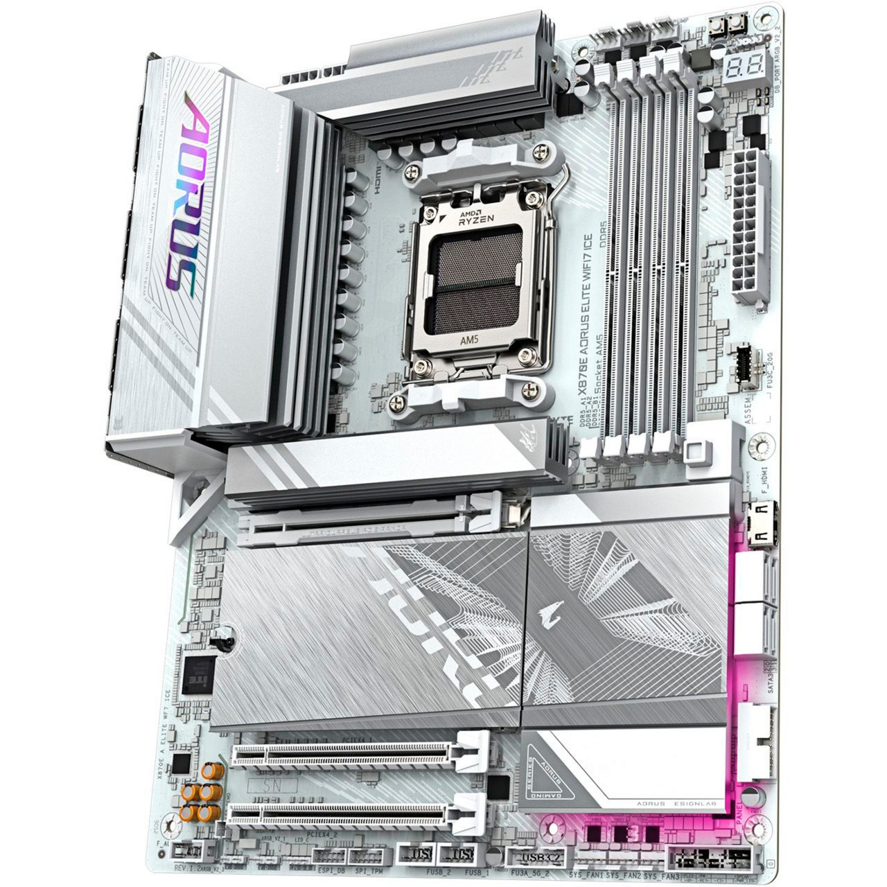 La GIGABYTE X870E AORUS ELITE WIFI7 ICE est basé sur le chipset AMD X870E et supporte les processeurs AMD pour socket AM5. Il dispose de quatre emplacements DDR5 pour un maximum de 256 Go de RAM. Les autres caractéristiques du GIGABYTE X870E AORUS ELITE WIFI7 ICE comprennent un emplacement PCIe 5.0 x16, un emplacement PCIe 4.0 x16 (x4 voies) et un emplacement PCIe 3.0 x16 (x2 voies). De plus, le GIGABYTE X870E AORUS ELITE WIFI7 ICE dispose d’un son à 8 canaux, d’une interface LAN 2.5 Gigabit, du WiFi 7, du Bluetooth 5.4, de quatre ports SATA3, de quatre ports M.2 et d’une gamme de ports USB.