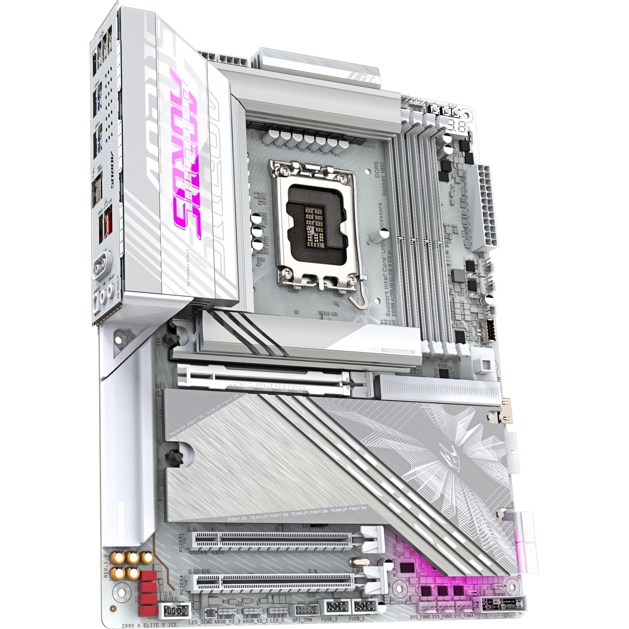 La carte mère GIGABYTE Z890 AORUS ELITE X ICE est basée sur le chipset Intel® Z890 et prend en charge les processeurs Intel® sur le socket 1851. Elle dispose de quatre emplacements DDR5 pouvant accueillir jusqu’à 256 Go de mémoire vive. La GIGABYTE Z890 AORUS ELITE X ICE est également équipée d’un emplacement PCIe 5.0 x16 et de deux emplacements PCIe 4.0 x16. La carte GIGABYTE Z890 AORUS ELITE X ICE dispose également d’un son à 8 canaux, d’une interface LAN 2,5 gigabits, du Wi-Fi 7, du Bluetooth 5.4, de quatre ports SATA3, de cinq ports M.2, de quatre interfaces USB-A 2.0, de quatre interfaces USB-A 3.2 (5 Gbit/s) et de deux interfaces USB-A 3.2 (10 Gbit/s).