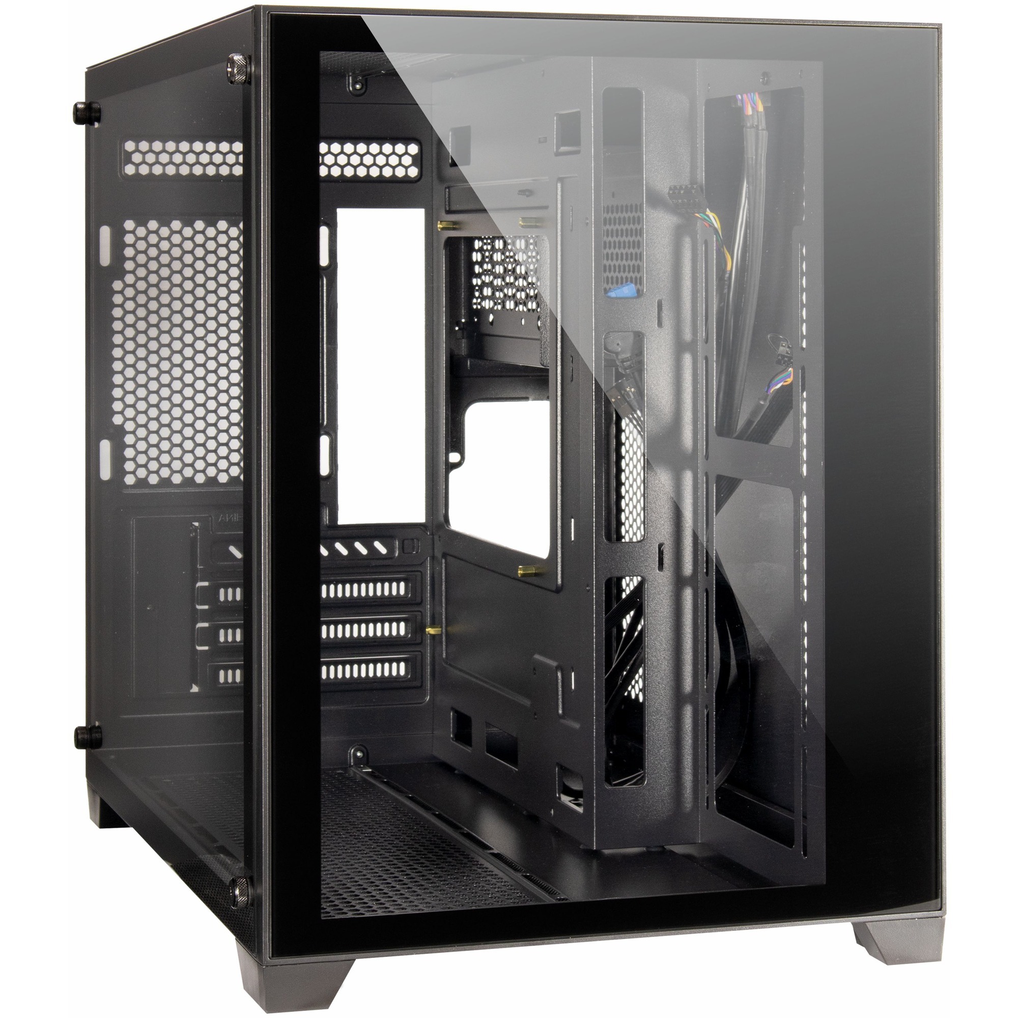 Design panoramique exceptionnel avec double panneau en verre trempé — Capacité d’accueil généreuse pour les cartes graphiques jusqu’à 375 mm — Grand nombre d’emplacements pour ventilateurs permettant un flux d’air personnalisé — Présence de filtres à poussière sur les zones stratégiques.