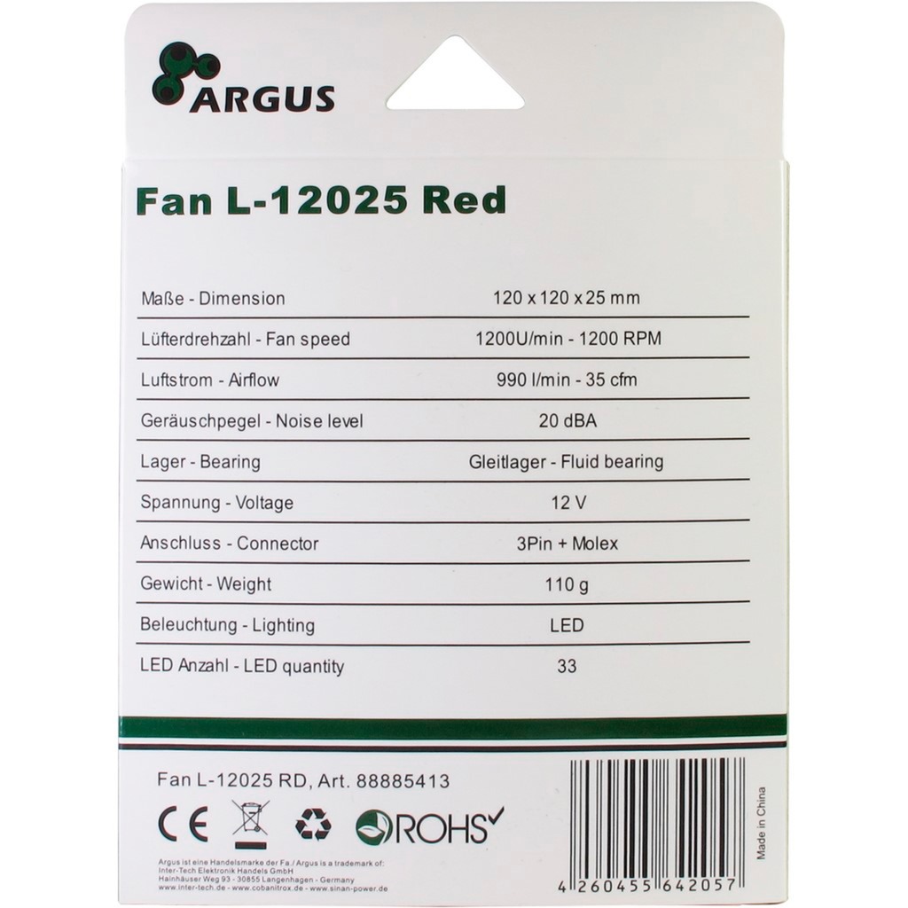 Diamètre du ventilateur: 12 cm, Vitesse de rotation (max): 1200 tr/min, Niveau de son (vitesse rapide): 20 dB, Courant d’air maximum: 59,46 cfm, Flux d’air: 54 m³/h, Type de roulement: Palier à fluide. Couleur du produit: Noir, Rouge