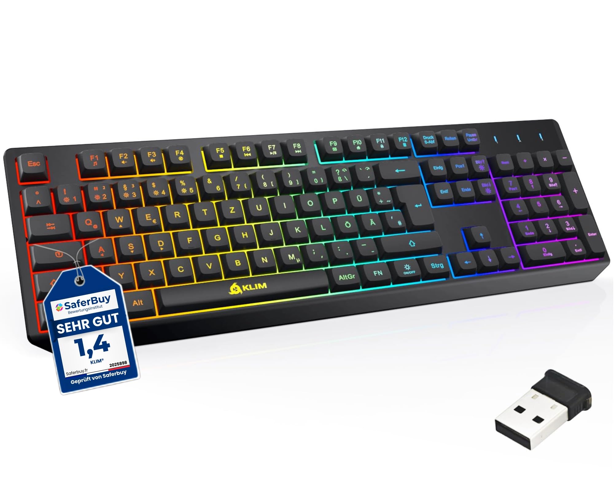 Le KLIM Chroma Wireless V6 se présente comme un clavier à membrane polyvalent, conçu pour offrir une expérience utilisateur fluide et sans encombrement de câbles. Ce modèle au format Full Size de 105 touches se distingue par son profil fin d’une épaisseur de 25 mm et son poids de 750 g, alliant ergonomie et stabilité sur votre bureau. Sa configuration en layout QWERTZ Deutschland répond aux besoins spécifiques de saisie tout en intégrant un rétroéclairage Chroma esthétique.