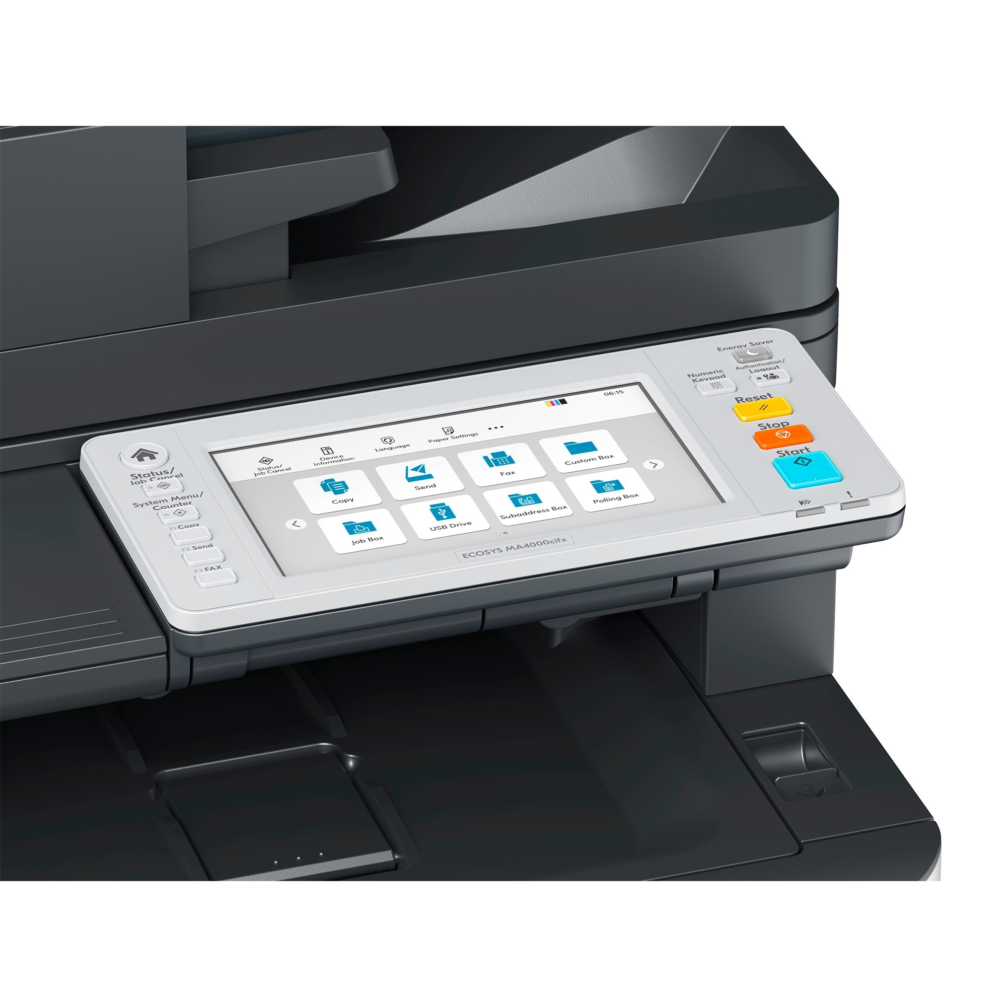 L’ECOSYS MA4000cix de Kyocera est une solution polyvalente efficace pour les petits et moyens groupes de travail. Cette imprimante multifonction laser couleur imprime jusqu’à 40 pages par minute et dispose en outre d’un scanner et d’un copieur performants avec un chargeur pouvant contenir 100 feuilles. Une interface fax performante est également intégrée. Le concept d’utilisation séduit par un écran tactile inclinable en façade, et de nombreuses fonctions de sécurité sont intégrées. L’appareil peut être intégré aux structures de travail existantes via LAN et prend également en charge l’impression directe depuis des appareils mobiles sous iOS ou Android. Grâce à la prise en charge de HyPAS de Kyocera, les utilisateurs peuvent utiliser leurs propres applications Java et optimiser davantage les processus de travail, par exemple via des menus personnalisés ou des affectations de touches spécifiques.