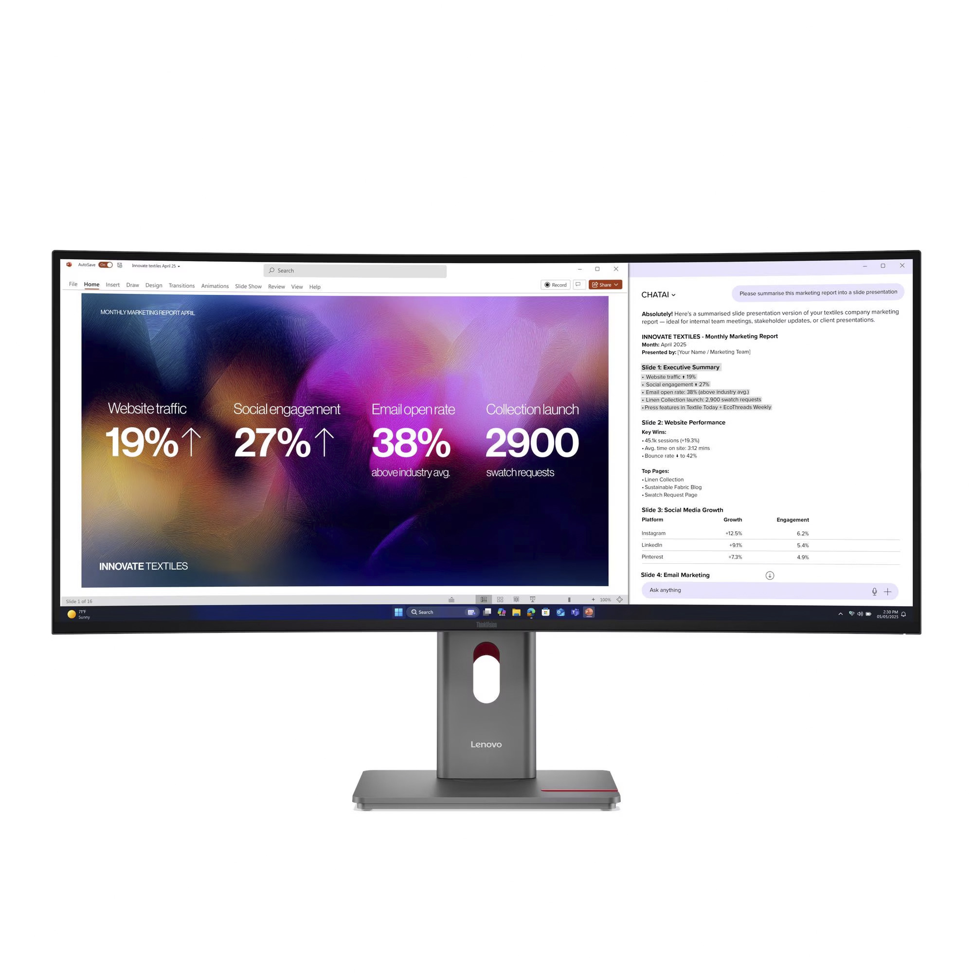 Le Lenovo ThinkVision P40WD-40 est un écran Ultrawide de haute qualité conçu spécifiquement pour les environnements professionnels qui établit de nouvelles normes grâce à sa taille d’écran impressionnante. L’écran incurvé de 39,7 pouces offre un espace considérable pour travailler en parallèle avec plusieurs applications et augmente nettement la productivité. Grâce à la résolution WUTHD 5K, le contenu est affiché de manière extrêmement nette et détaillée, ce qui est particulièrement bénéfique pour les tâches gourmandes en données et les projets créatifs. Le panneau IPS Black assure des contrastes élevés, des noirs profonds et une reproduction des couleurs très précise. La forme courbe crée une expérience de vision agréable et claire sur toute la surface de l’écran. Pour le travail ergonomique, le moniteur peut être ajusté de manière flexible en hauteur, inclinaison et rotation. En termes de connectivité, le ThinkVision P40WD-40 propose une gamme complète de HDMI 2.1 et DisplayPort 1.4 pour des sources vidéo classiques. Thunderbolt 4 permet un transfert rapide de données, une connexion en série et un câblage bien ordonné. Le port amont Thunderbolt peut être utilisé pour fournir simultanément un signal image aux ordinateurs portables et les charger jusqu’à 140 watts. L’équipement est complété par des ports Thunderbolt, USB-C et plusieurs ports USB-A supplémentaires, ainsi qu’un port Ethernet RJ-45 intégré pour une connexion réseau stable, faisant de l’écran l’interface centrale des lieux de travail modernes.