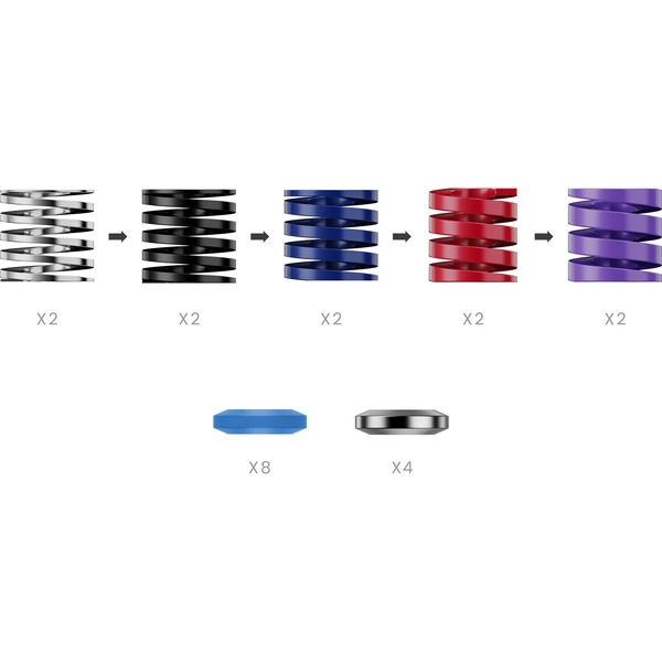 | Informations complémentaires | Ensemble composé de 2x ressorts blancs 1,6, 2x ressorts noirs 2,0, 2x ressorts bleus 2,6, 2x ressorts rouges 3,3, 2x ressorts violets 4,0, 8x blocs d'amortissement, 4x blocs en aluminium |