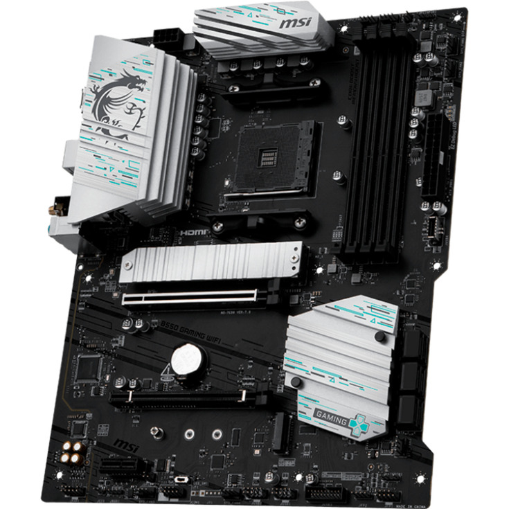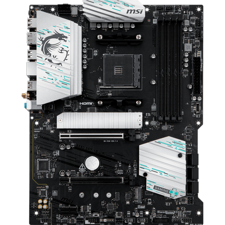 La carte mère MSI B550 GAMING WIFI est basée sur le chipset AMD B550 et prend en charge les processeurs AMD avec un socket AM4. Elle dispose de quatre emplacements DDR4 pour une mémoire maximale de 128 Go. La MSI B550 GAMING WIFI dispose également d’un emplacement PCIe 4.0 x16, d’un emplacement PCIe 3.0 x4 et d’un emplacement PCIe 3.0 x1. De plus, la MSI B550 GAMING WIFI offre un son 8 canaux, une interface LAN 1 Gigabit, six ports SATA3, deux ports M.2, le Wi-Fi 5, le Bluetooth 5, quatre interfaces USB-A 2.0, deux interfaces USB-A 3.2 (5 Gbit/s), une interface USB-A 3.2 (10 Gbit/s) et une interface USB-C 3.2 (10 Gbit/s).