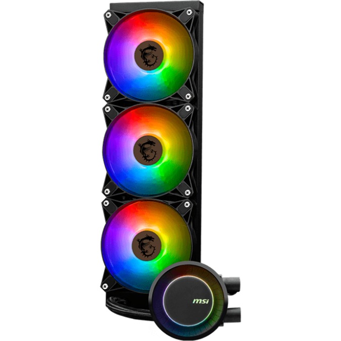 Le waterblock du MSI MAG CoreLiquid E360 360mm à refroidissement liquide dispose d’un éclairage ARGB de grande surface qui fait briller le système. Le dissipateur rotatif à 270 degrés permet un montage facile dans n’importe quelle orientation. La surface de contact entre le liquide de refroidissement et la base en cuivre du waterblock a été agrandie, maximisant ainsi la dissipation thermique de la CPU. La pompe à eau performante assure un flux thermique élevé, permettant de maintenir des températures basses. Le cœur de la pompe est un moteur conçu pour un fonctionnement silencieux, générant ainsi des vibrations minimales.
