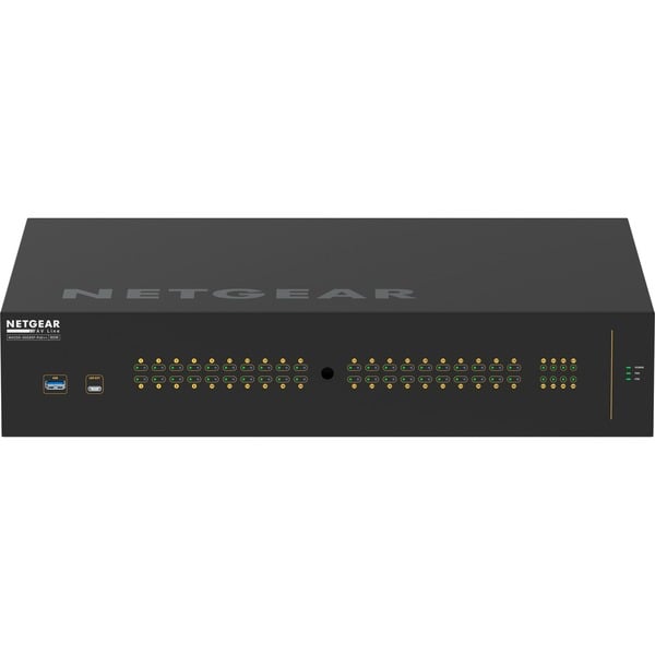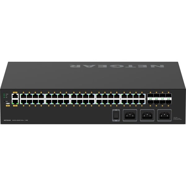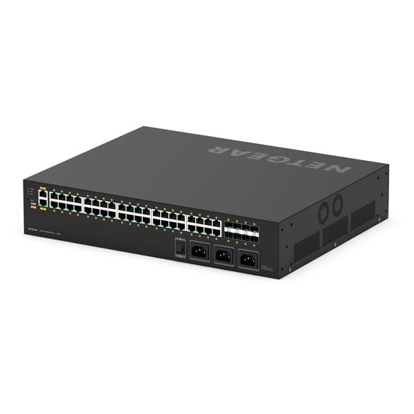 Le Netgear M4250-40G8XF-PoE++ s’impose comme une solution de commutation de pointe, spécifiquement optimisée pour les environnements audiovisuels professionnels exigeants. Ce châssis robuste, affichant des dimensions de 440 mm de largeur, 86,4 mm de hauteur et 350 mm de profondeur pour un poids de 9,8 kg, est conçu pour s’intégrer parfaitement dans vos infrastructures en rack professionnelles.