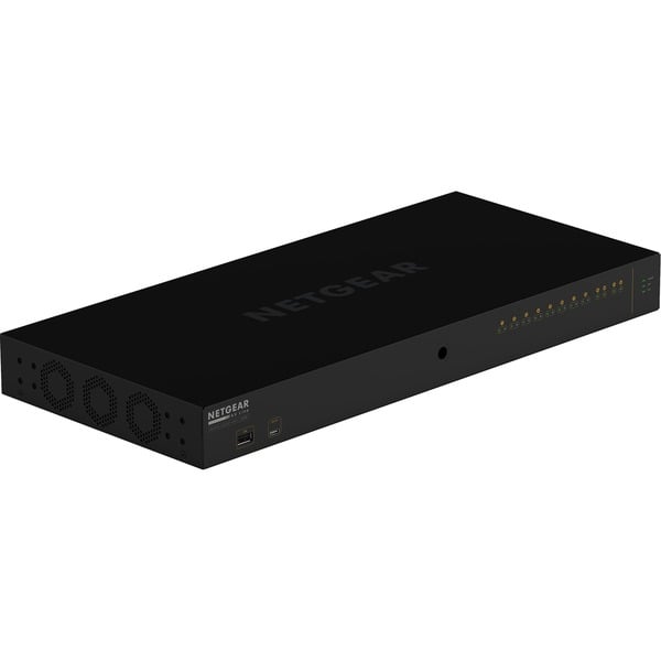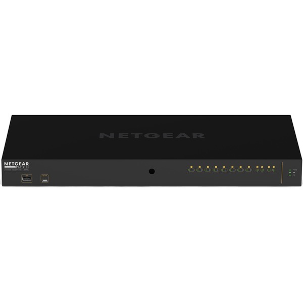 Le Netgear M4250-10G2XF-PoE+ est une solution de commutation de haute performance, spécifiquement conçue pour répondre aux exigences critiques des environnements audiovisuels professionnels. Ce switch administrable L2+/L3 Lite se distingue par son ergonomie pensée pour l’intégration en rack, affichant des dimensions de 440 mm de largeur, 43,2 mm de hauteur et 200 mm de profondeur pour un poids de 2,85 kg. Son design noir sobre dissimule une connectique robuste dont les ports sont orientés vers l’arrière, une caractéristique idéale pour maintenir un câblage propre et organisé au sein de vos installations techniques.