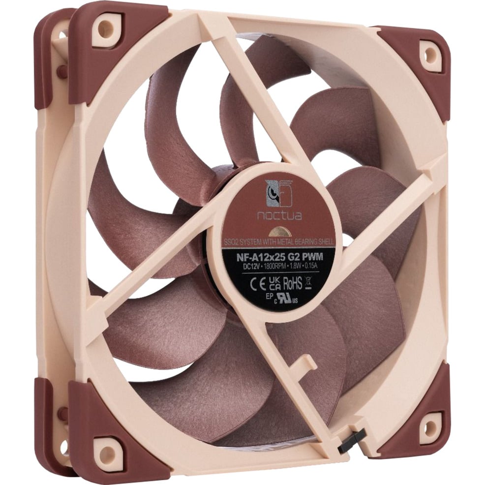 Le Noctua NF-A12x25 G2 PWM se distingue par son excellent rendement et son faible niveau sonore. Grâce à sa turbine Progressive-Bend Impeller hautement optimisée avec winglets, ses canaux d’accélération du flux et son moyeu Centrifugal Turbulator en Sterrox LCP, ainsi qu’à un pas de rotor de seulement 0,5 mm, le NF-A12x25 G2 offre une combinaison impressionnante de performances et de silence. Il offre des performances élevées dans tous les scénarios d’application, qu’il soit utilisé comme ventilateur de boîtier ou comme refroidisseur sur des radiateurs de refroidissement par eau.Les accessoires fournis permettent de l’adapter à différents environnements: le NF-A12x25 G2 PWM est livré avec une bague anti-vibration NA-AVG1 préinstallée, qui permet une meilleure étanchéité sur les radiateurs. Un adaptateur Low-Noise est également inclus, qui réduit la vitesse maximale en mode PWM de 1800 à 1500 tours par minute. Grâce à son roulement SSO2, le moteur à très faibles pertes offre non seulement un silence impressionnant, mais peut également mobiliser des réserves de vitesse supplémentaires si nécessaire afin de maintenir la vitesse du ventilateur constante même à haute pression, ce qui constitue un véritable atout pour une utilisation sur des refroidisseurs ou des radiateurs.