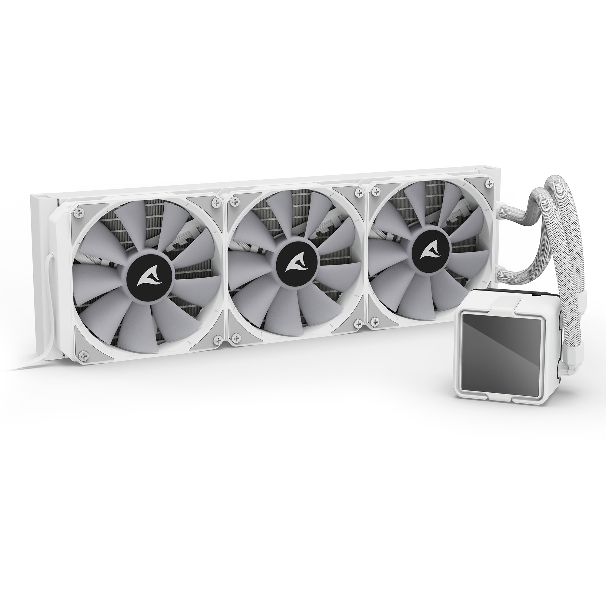 Le S100 ARGB blanc de Sharkoon est un système de refroidissement par eau tout-en-un avec un radiateur de 360 mm qui combine un look impressionnant et des performances de refroidissement puissantes. La pompe extra-large avec son effet miroir infini crée un jeu de lumière unique, tandis que la plaque de refroidissement en cuivre, les trois ventilateurs ARGB PWM réglables avec précision et la pâte thermique DOWSIL™ fournie garantissent un refroidissement fiable et une efficacité maximale.