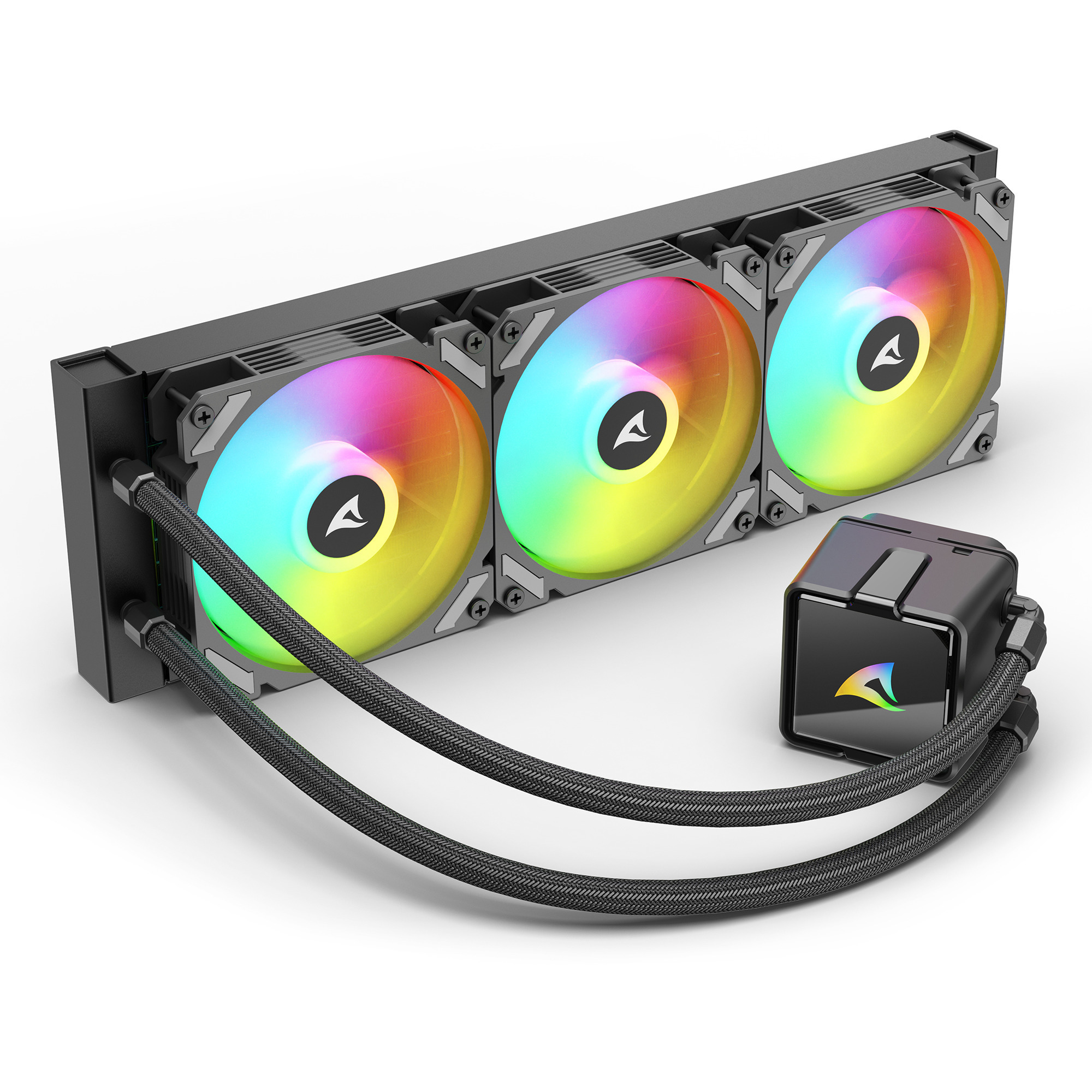 Le S60 ARGB noir de Sharkoon est un puissant refroidisseur à eau tout-en-un avec un radiateur de 360 mm, qui combine un design moderne et des performances de refroidissement efficaces. Avec trois ventilateurs ARGB PWM préinstallés, une tête de pompe remarquable avec effet miroir et une plaque en cuivre de haute qualité, il offre des performances élevées, une gestion optimale des câbles et une compatibilité étendue avec les cartes mères les plus courantes. Grâce aux connecteurs en série, les ventilateurs du S60 ARGB peuvent être facilement connectés entre eux. Cela réduit considérablement la quantité de câbles et garantit une configuration matérielle soignée et esthétique.