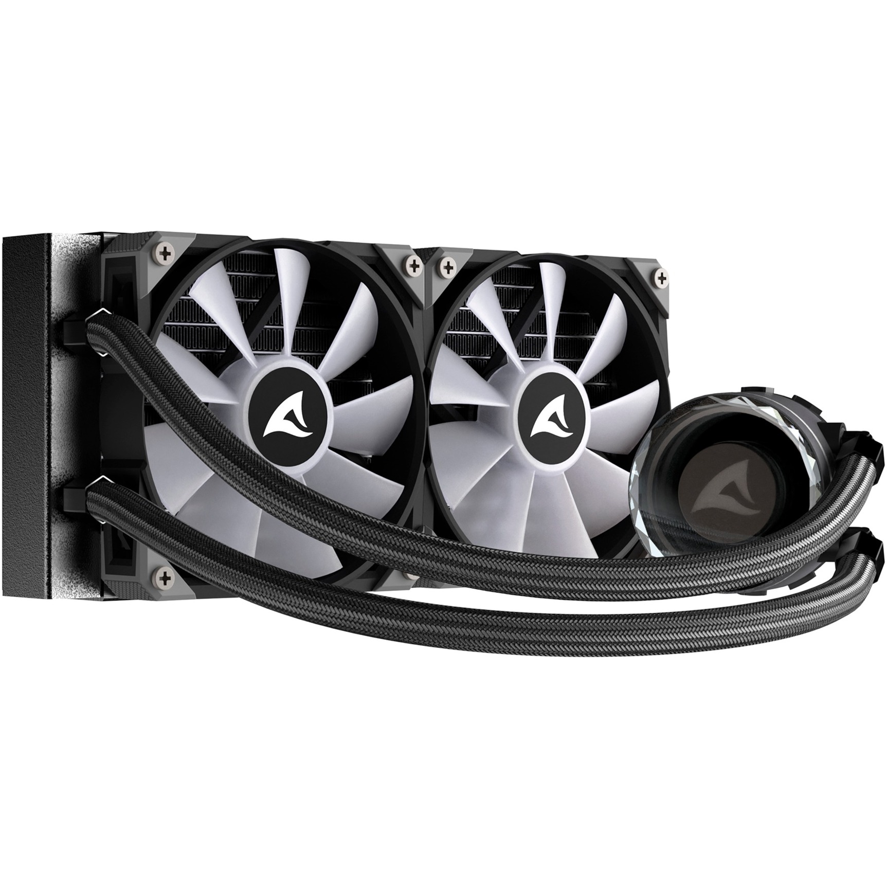 Avec son radiateur de 240 mm, le S80 RGB est un système de watercooling compact tout-en-un qui assure un refroidissement efficace de tous les processeurs. Les ventilateurs RGB-PWM adressables offrent non seulement une mise en valeur visuelle en 16,7 millions de couleurs, mais assurent également une bonne performance de refroidissement avec une vitesse allant jusqu’à 2 000 tr/min. L’installation est facile grâce aux tuyaux flexibles enveloppés de textile et aux supports de montage inclus.Ventilateurs entièrement contrôlablesLes deux ventilateurs RGB-PWM du radiateur 240 mm de la S80 RGB disposent non seulement d’un éclairage RGB entièrement adressable, mais leur vitesse peut également être contrôlée dans une plage de 600 à 2 000 tr/min. Et pour faciliter la gestion des câbles, les ventilateurs peuvent être connectés en série. Il dispose également d’un contrôle PWM pour des performances optimales avec un faible bruit.Dissipation optimale de la chaleurComme les ventilateurs, le bloc d’eau et l’unité de pompe sont également dotés d’un éclairage RGB et se présentent avec un effet miroir infini chic. La plaque de cuivre et la pâte de refroidissement DOWSIL de haute qualité incluse assurent une dissipation optimale de la chaleur.Compatible avec tous les processeursGrâce aux deux supports de montage inclus pour les CPU de tous les fabricants, cette solution de refroidissement par eau tout-en-un est préparée de manière optimale pour une utilisation directe dans n’importe quel boîtier de PC.Flexible et facile à installerLes tuyaux flexibles rendent l’installation dans un boîtier de PC aussi facile que possible. Pour une protection optimale contre les rayures, les tuyaux sont tressés avec du textile.Logo Sharkoon rotatifPour s’assurer que le logo Sharkoon est toujours horizontal, il peut être facilement tourné à la bonne position sur le bloc d’eau et l’unité de pompe.