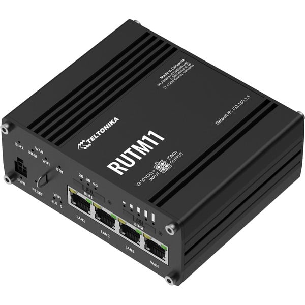 Le RUTM11 est un routeur LTE industriel de Teltonika, conçu pour les applications nécessitant un débit de données élevé et une connexion réseau robuste avec une tolérance zéro pour les latences élevées et les interruptions. Le RUTM11 est équipé de quatre ports Gigabit RJ45, du Wi-Fi double bande et de capacités Dual-SIM, permettant ainsi plusieurs scénarios de basculement. Ce routeur est compatible LTE Cat 6, permettant d’atteindre des débits cellulaires allant jusqu’à 300 Mbit/s, qui peuvent être optimisés par l’agrégation de porteuses.