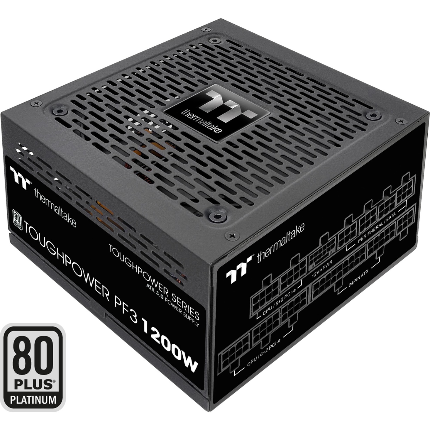 La Thermaltake Toughpower PF3 1200W s’établit comme une solution énergétique de premier plan pour les configurations informatiques les plus exigeantes. Conçue pour répondre aux normes ATX 3.0, elle intègre nativement un connecteur PCIe Gen 5.0 12+4 broches, permettant d’alimenter sereinement les cartes graphiques de dernière génération. Sa puissance totale de 1200 W, dont l’intégralité peut être délivrée sur le rail +12 V avec une intensité de 100 A, assure une stabilité électrique exemplaire pour vos composants critiques.