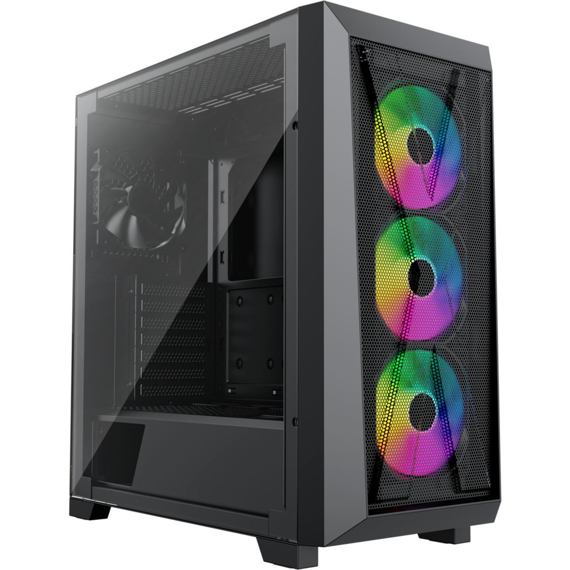 Le refroidissement est un point fort : la face avant maillée optimise le flux d’air et le boîtier est livré avec 3 ventilateurs ARGB de 120 mm à l’avant et 1 ventilateur ARGB de 120 mm à l’arrière. Vous pouvez encore étendre les possibilités avec jusqu’à 3 ventilateurs supplémentaires de 140 mm ou 2 ventilateurs de 200 mm, ainsi que des radiateurs en façade et en haut jusqu’à 360 mm. Compatible watercooling, il répond aux besoins des configurations les plus exigeantes.
